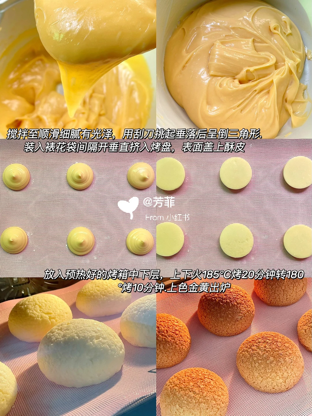 4⃣泡芙面糊垂直挤入烤盘,间隔开约1~1.5个泡芙的距离,表面盖上酥皮.放入预热好的烤箱中下层,上下火185℃烘烤20分钟,再转180℃烘烤10分钟.上色金黄取出⚠️烘烤温度和时间需按自家烤箱温差灵活调节.用硅胶透气烤垫受热匀底部会更平整,一般烘烤到位烤好不用焖,如果拿捏不准就焖几分钟再出炉