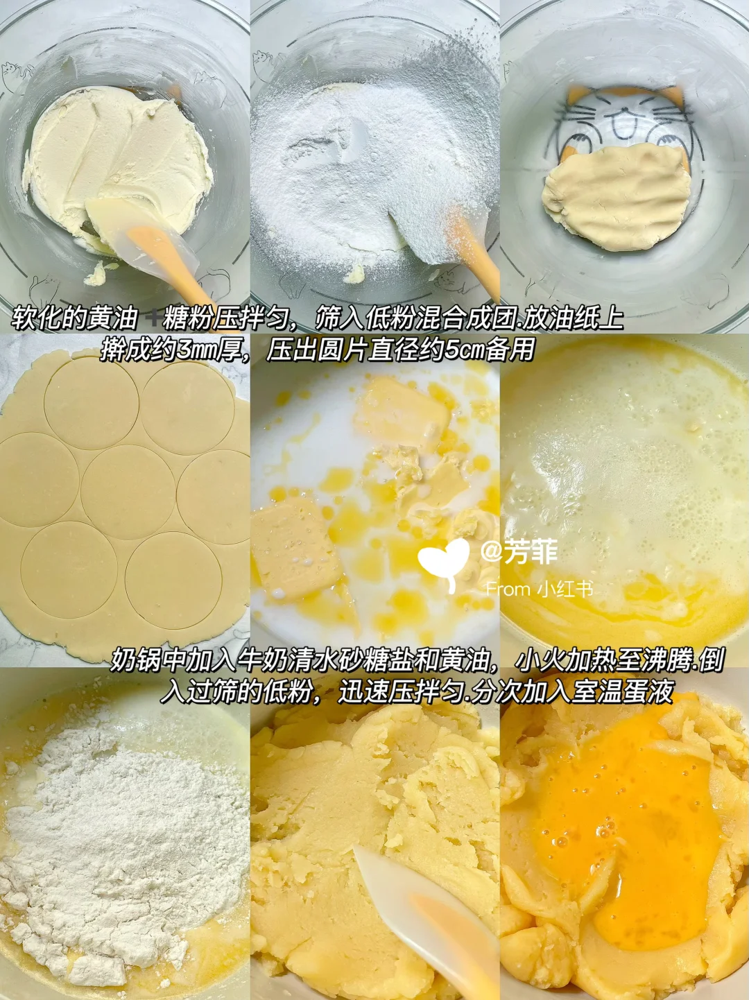 1⃣准备好食材.先做酥皮部分,将软化的黄油加糖粉压拌匀,筛入低粉混合成团.放两张油纸间擀成约3mm厚,压圆片(直径5㎝)冷藏备用