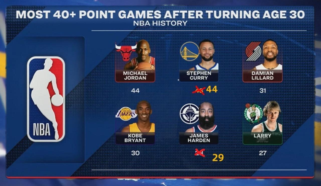 数据帝:库里超詹姆斯连刷4项历史第一,哈登创最老纪录,威少1万助攻成控卫第一人! 一、勇士109-108险胜马刺的比赛中,库里投篮26投16中,三分17中9,罚球8中8,砍下49分4篮板2助攻2抢断的数据。1、这是库里35岁以后第7次砍下45+,超越詹姆斯的6场独享历史第一。2、这是库里30岁以后第44次40+,追平乔丹并列历史第一。3、库里连续两场比赛得到45+,成NBA历史最老控卫。4、库里连续两场得到至少46分,成NBA历史最老球员。 二、在快船133-127战胜独行侠的比赛中,哈登投篮25中13,三分12中6,罚球11中9,砍下41分14篮板11助攻1抢断2盖帽的三双数据。1、哈登成为快船队史首位砍下40+三双的球员。2、哈登以36岁81天的年龄超越伯德成为NBA历史砍下40+三双最老球员。3、这是哈登快船生涯第八次三双,独享快船队史第一。 三、在国王110-124输给森林狼的比赛中,威少投篮11投5中,三分5中2,罚球4中1,砍下13分10篮板13助攻的三双数据。恭喜威少职业生涯助攻数突破1万,成为NBA历史继詹姆斯后第二位达成至少25000分+10000助攻的球员,也是首位达成此成就的控卫球员。