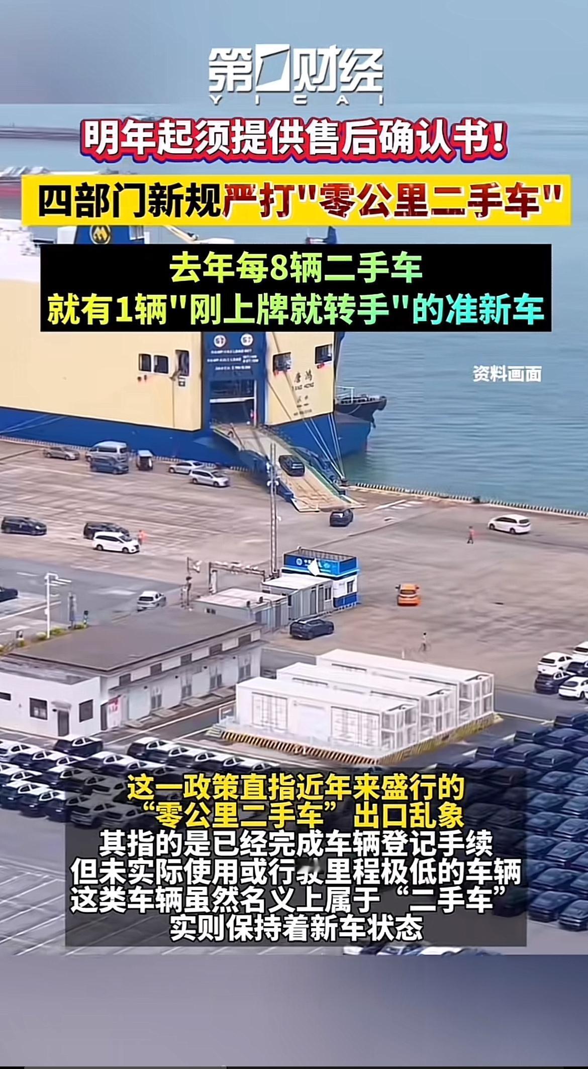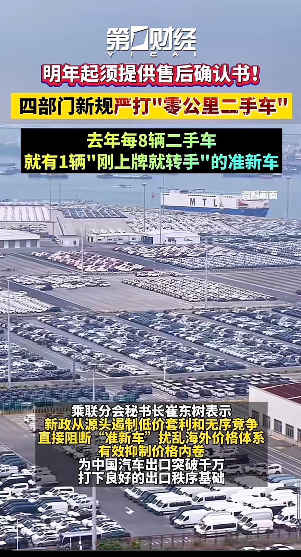 四部门出手严打“零公里二手车”,这新规太及时了!“零公里二手车”名义上是二手,实际跟新车没啥区别。2024年二手车市场里,“登记≤3个月、里程≤50公里”的车占比达12.7%,相当于每8辆二手车就有1辆是“刚上牌就转手”的准新车。 从2026年1月1日起,申请出口距注册登记日期不满180天的车辆,得提交生产企业的《售后维修服务确认书》,不然不给出口许可证。这能有效遏制新车以二手车名义出口的乱象,让二手车出口回归本质,也保障了消费者权益,推动行业迈向“价值增长”。