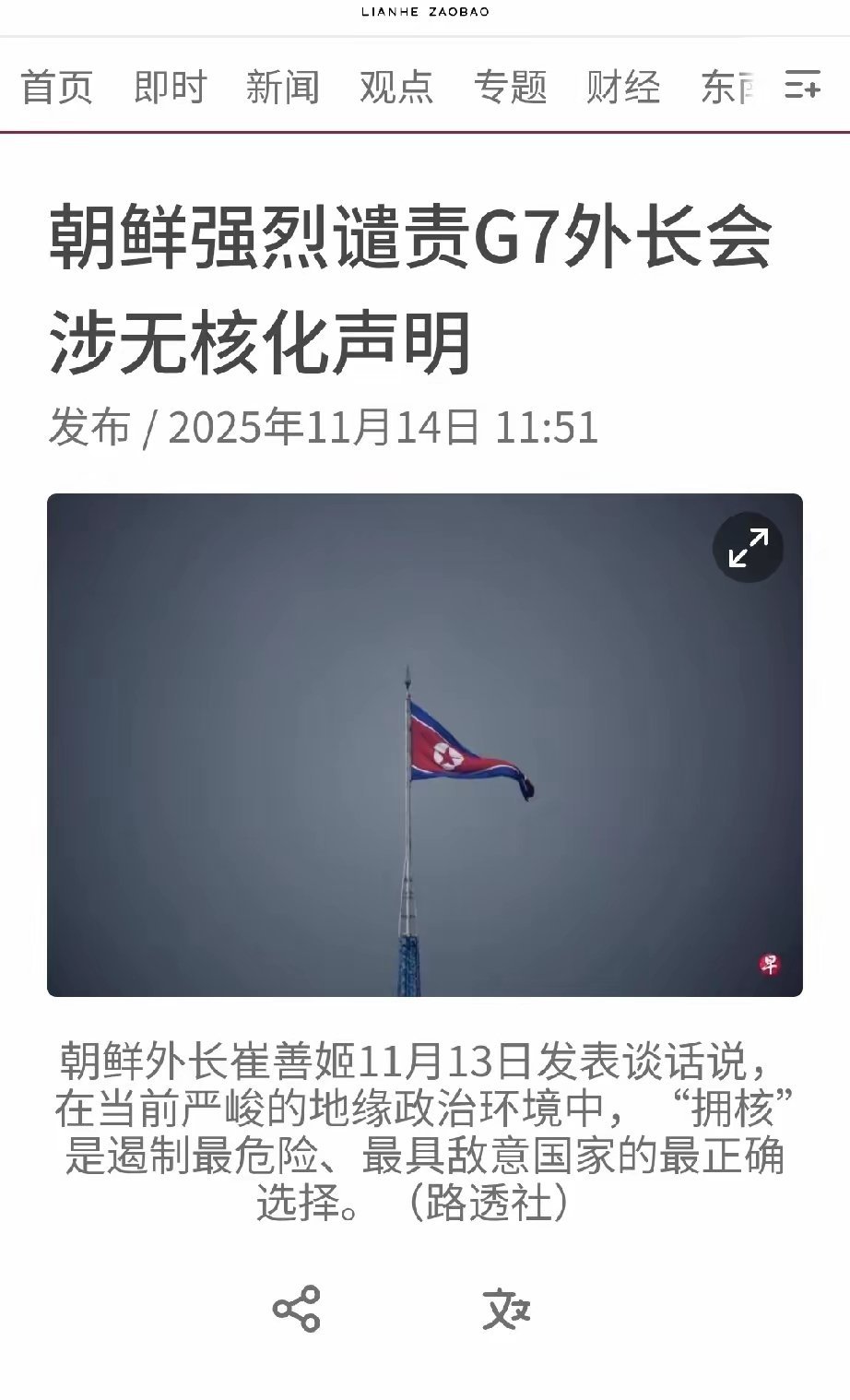美国前国务卿贝克所言:“你不能在自己后院养毒蛇,却希望它只攻击你的邻居。”完美闭环!朝鲜拥核——韩国要造核潜艇——日本要去“无核三原则”———“G7发朝鲜半岛无核化联合声明”———“朝鲜强烈谴责G7外长会涉无核化声明”东亚三国朝,韩,日,似乎进入了“核竞赛”的逻辑闭环中。这一波我们该占谁?放眼周边目前不算自己拥核的有:俄罗斯,印度,巴基斯坦,朝鲜一共四个国家放眼全世界目前其他拥核的国家还有:美国,英国,法国,以色列也就意味着在我们身边的,和不在我们的身边的是一半一半。而在我们身边的这些是最不靠谱的那批。如何打破“闭环”,阻止进一步发展?仁者见仁,智者见智,必须要有人和部门为我们外部环境承担责任!胡锡进表态,都有等于都没有