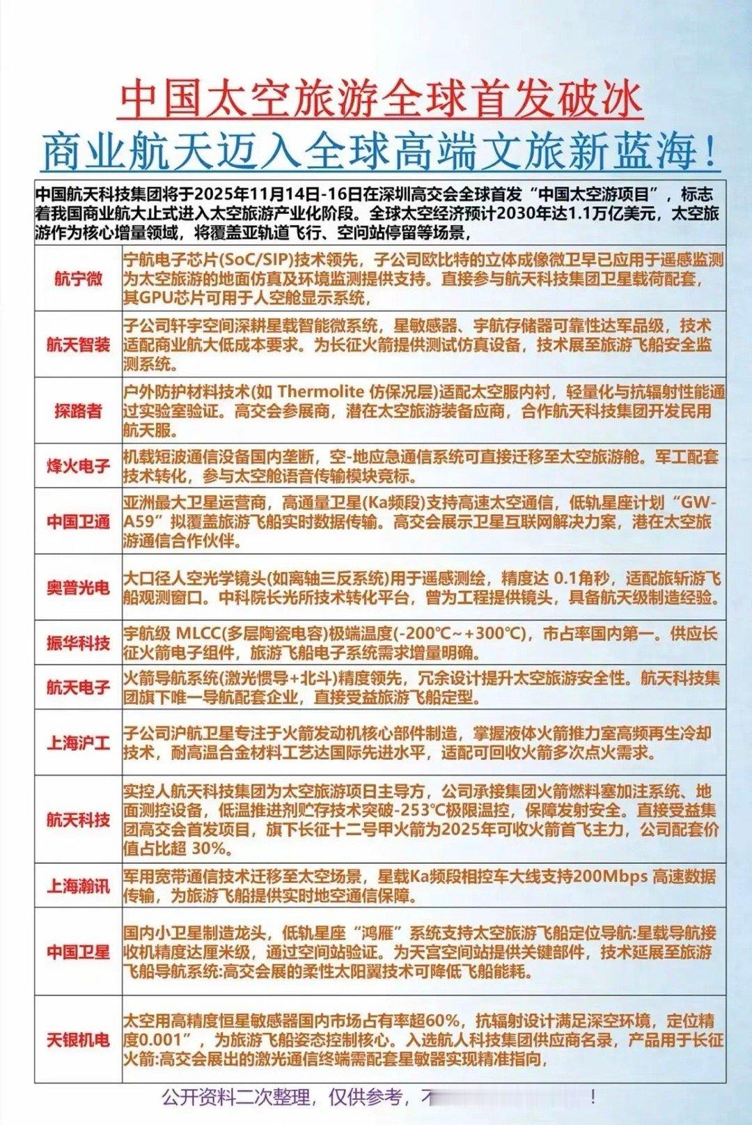 中国太空旅游全球首发破冰!商业航天迈入全球高端文旅新蓝海!中国航天科技集团将于2025年11月14日-16日在深圳高交会全球首发“中国太空游项目”,标志着我国商业航大止式进入太空旅游产业化阶段。全球太空经济预计2030年达1.1万亿美元,太空旅游作为核心增量领域,将覆盖亚轨道飞行、空问站停留等场景。