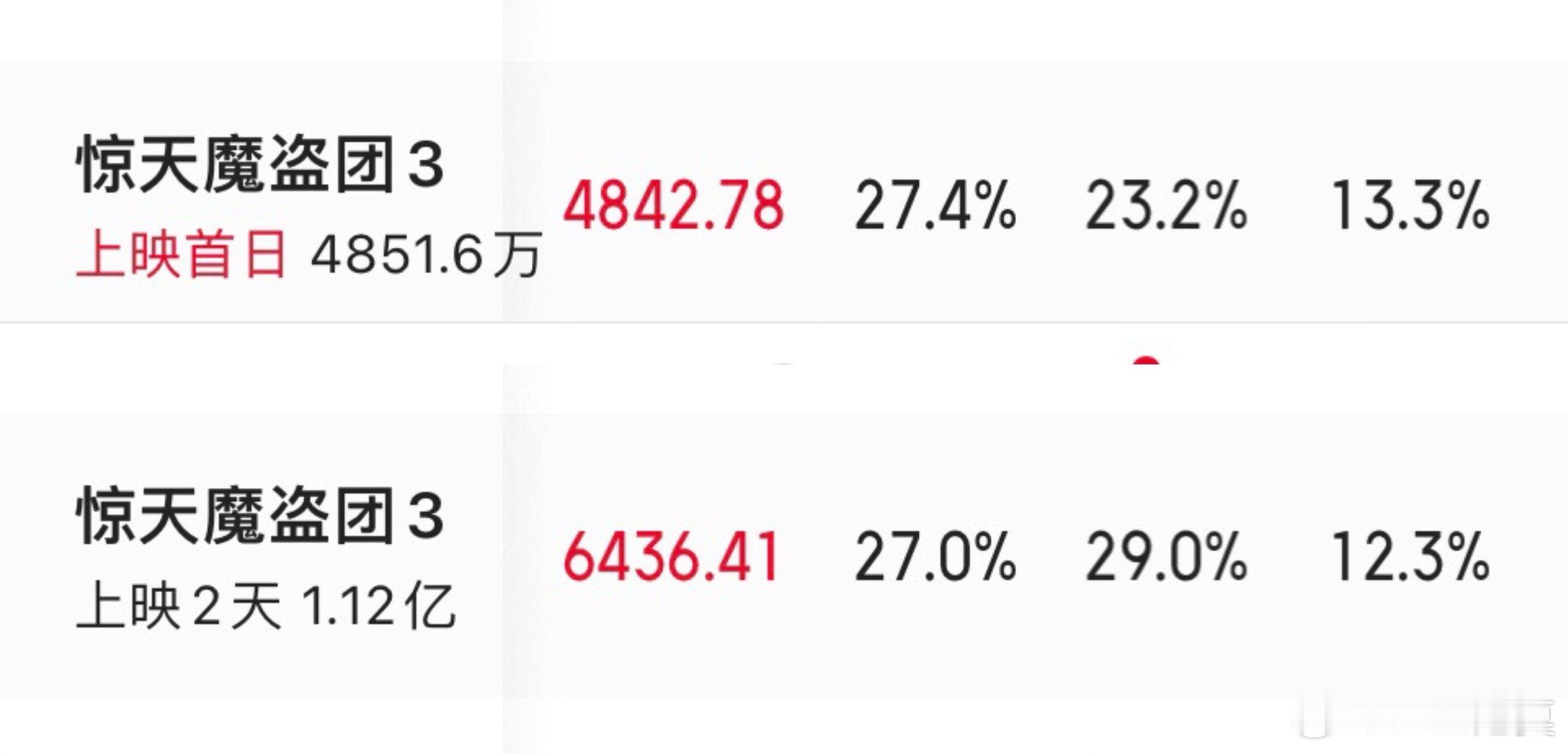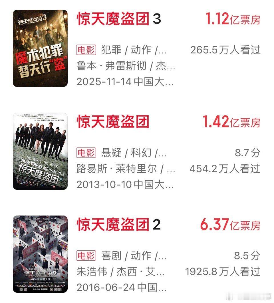 《惊天魔盗团3》票房表现一般。今天周六,休息日,但上座率还不及昨天(工作日)。该片第一部内地票房1.42亿,第二部票房6.37亿,正在上映的第三部目前预测票房为3.03亿,不及第二部的一半。