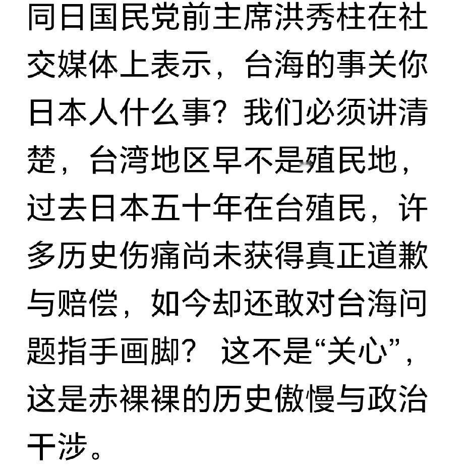 面对“搞事早苗”的疯狂言论,岛内一些立场清醒的人士纷纷发声,国民党前主席洪秀柱竟然是这么说的,让人点赞! 洪秀柱在社交媒体上表示:“台海的事关你日本人什么事?我们必须讲清楚,台湾地区早已不是殖民地,过去日本五十年在台殖民,许多历史伤痛尚未获得真正道歉与赔偿,如今却还敢对台湾问题指手画脚,这不是关心,这是赤裸裸的历史傲慢与政治干涉。” 洪秀柱重申:“台湾问题是两岸内战余绪的政治问题,轮不到外国政客来指点江山,任何外部势力妄想协台,挑战中国核心利益,结果只有一个,必然失败……”