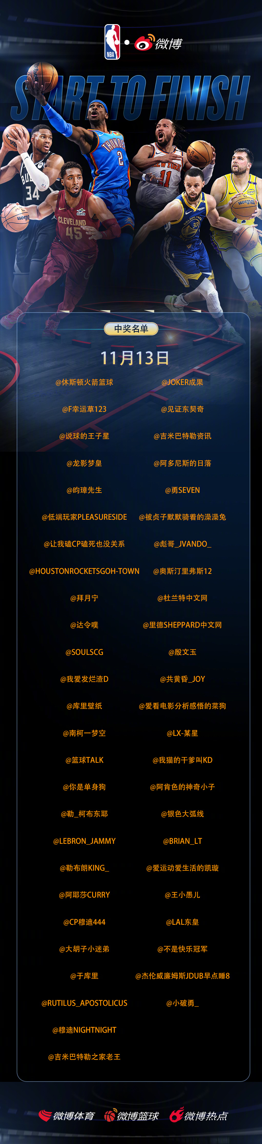 「 」11月13日中奖名单恭喜以下参与用户获得6.6🧧球员打分活动进行中!每日抽50个红包参与方式:比赛日进入任意NBA球队超话,球员打分+10字评论,自动获得资格!