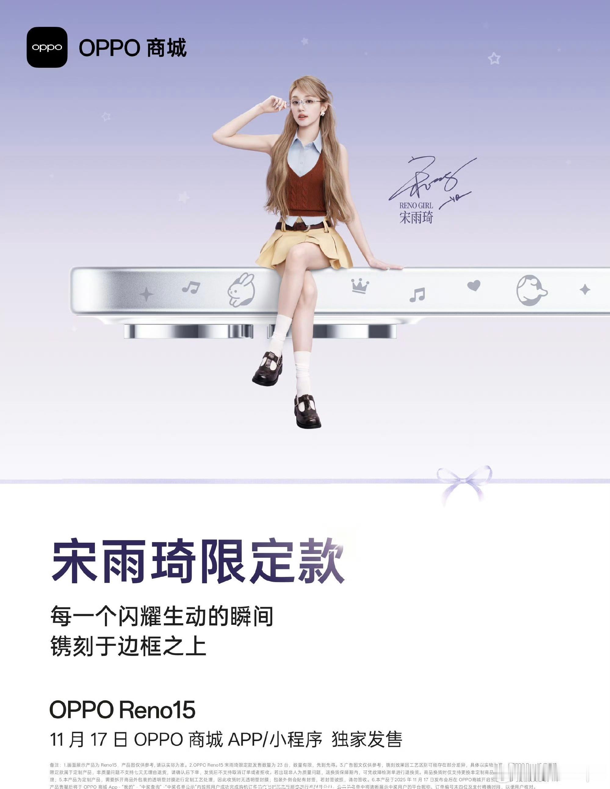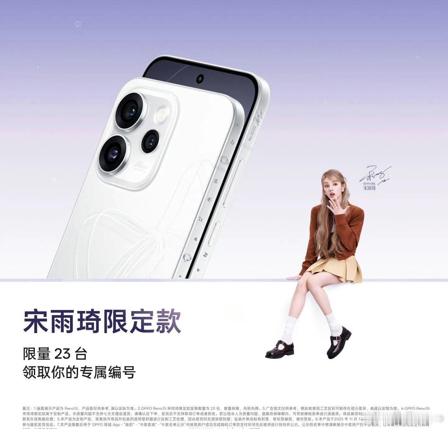 OPPO Reno15宋雨琦限定款明天发布该限定款全球限量23台每台机身侧边均刻有专属编号和宋雨琦签名并采用全新的镌刻图案设计大家觉得怎么样,冲不冲?属于买不到系列