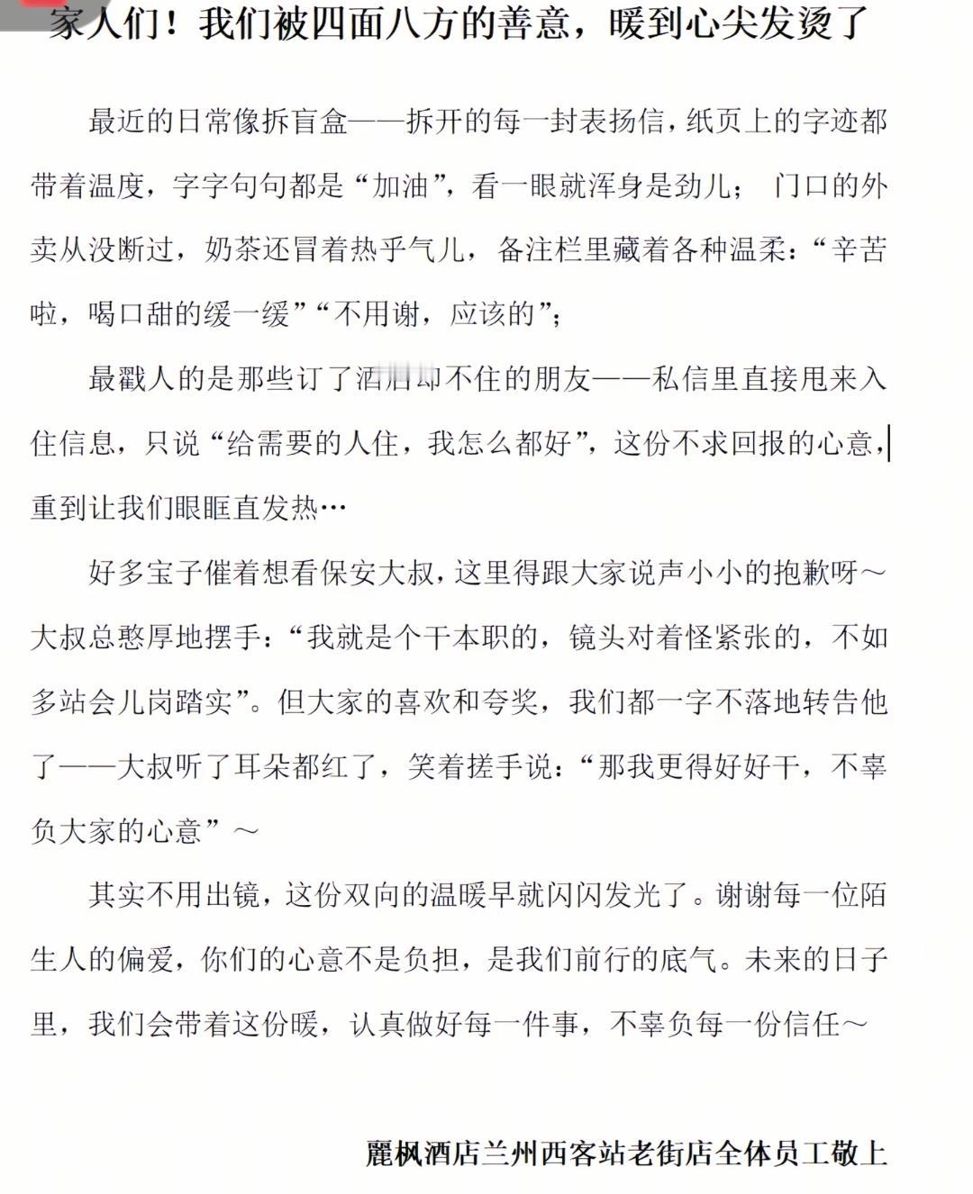 兰州麗枫酒店发声了 没说一句“✂️姐”的坏话,有的只是酒店方对客人的关心,这样的酒店必须狠狠涨粉啊! 目前的实际情况是“涨粉速度还是有些慢了”,虽说店里是满员的,但要是账号也起来了就更好了,真的恭喜这家店,你们凭服务带动了兰州文旅! 网友热呼“知道了,去兰州,住(麗)丽枫,不是麓枫”! 我看当时“✂️姐”发出视频的时候,当时涨粉可老快了,流量超过她其他的旅游视频,好家伙那会还置顶,生怕人不知道她干的好事,最离谱的是当时还有一群支持者帮忙发声,如今“比尔碰瓷”姐账号销声匿迹了,这群帮忙发声的是不是啪啪打脸了都,“知心姐姐”们可涨点心吧! 再来看这家酒店出的公关文,全篇用词太好了,看着都给人一种温暖的感觉“被四面八方的善意暖到心尖发烫了”,其中也提到了保安大叔“做好本职工作,以后会做的更好”,保安大叔也是被暖到了。 有网友说“给保安大叔发200安慰奖吧,保安大叔活了半辈子估计也是第一次碰到这样蛮不讲理的女人”,差点就背锅了,还好现在的网友已经练就了一双“火眼金睛”。 也有人说“值得表扬的是你们酒店会理解员工的工作和不容易,我曾经是兰州某号称是五星酒店的员工,无论对面的客人多么无理取闹欺负员工(有辱骂的员工人格的,甚至还有过对员工动手的客人),酒店都第一时间“袒护”客人,根本不顾员工的委屈心酸和死活”。 无疑,这间酒店在客人和员工之间,都做的很到位,尤其是对网络上陌生的我们,都热情的回应,这家店可以闭眼入 去兰州必须住你们酒店! 给酒店保安大叔打call!