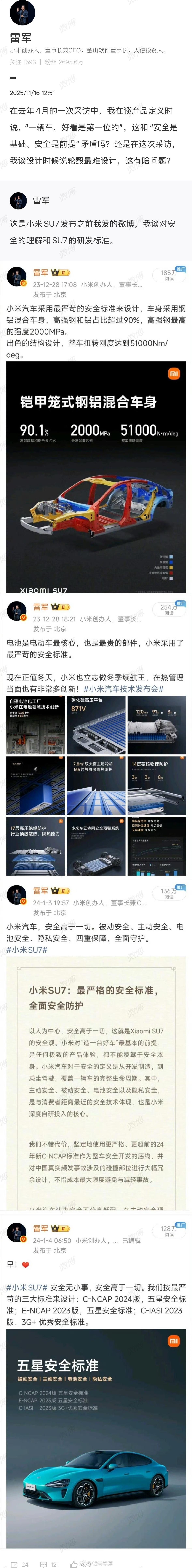 雷军今早连发三条微博谈 SU7 及安全问题,「一辆车好看是第一位的」和「安全是基础、安全是前提」不矛盾。雷总这样的语气比较少见。
