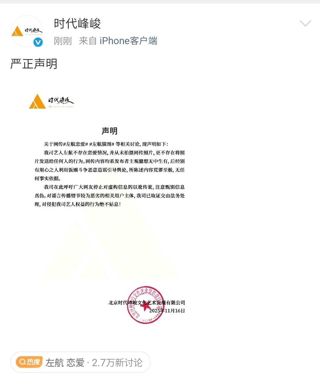 今日,网传引发网友热议。对此,时代峰峻发严正声明,称左航不存在恋爱情况,并从未拍摄网传照片,更不存在将照片发送给任何人的行为,“网传内容均系发布者主观臆想无中生有”,呼吁停止对虚构信息以讹传讹,已对谣言传播情节恶劣者取证。