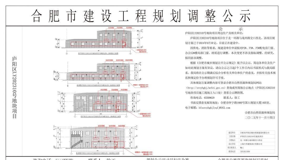 庐阳区LY202310号地块项目规划方案调整公示,即庐阳城更&招商庐州臻境位于北一环路与毫州路交口西北,因供电、消防等要求,现建设单位申请拟对P2、P3、P5幢配电房门窗、办公S2幢楼局部门窗、材质进行调整。 本次变更不涉及指标调整。经研究,拟同意该调整。 合肥 合肥庐阳区