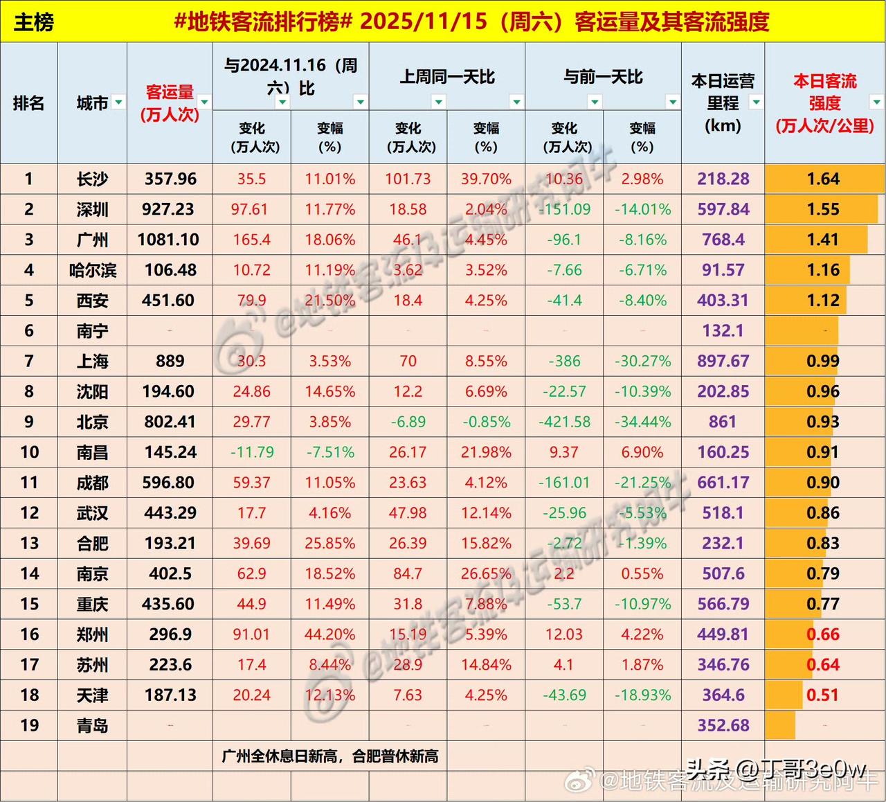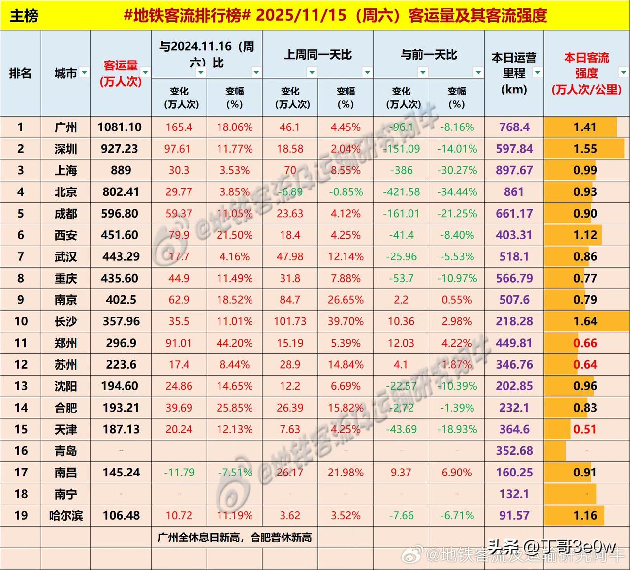 喜报:重庆、西安、武汉连续六天地铁客流量超400万人次[呲牙][呲牙][呲牙] 爆料 身边事 地铁客流排行榜 中国地铁客流日报 昨日客流 排行榜 周六 2025年11月15日 星期⑥ 全国重点城市轨道交通客流量排行榜: 广州:1081.10万广州地铁 深圳:927.23万深圳地铁 上海:889.00万 北京:802.41万北京身边事 成都:596.80万 西安:451.60万西安身边事 武汉:443.29万武汉地铁 重庆:435.60万重庆身边事 南京:402.50万南京地铁 长沙:357.96万长沙身边事 郑州:296.90万郑州爆料 苏州:223.60万 沈阳:194.60万 合肥:193.21万合肥身边事 天津:187.13万天津爆料 青岛:145万+ 南昌:145.24万江西南昌身边事 南宁:100万+南宁爆料 哈尔滨106.48万