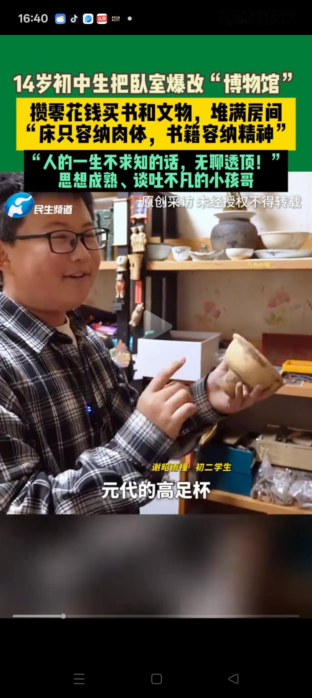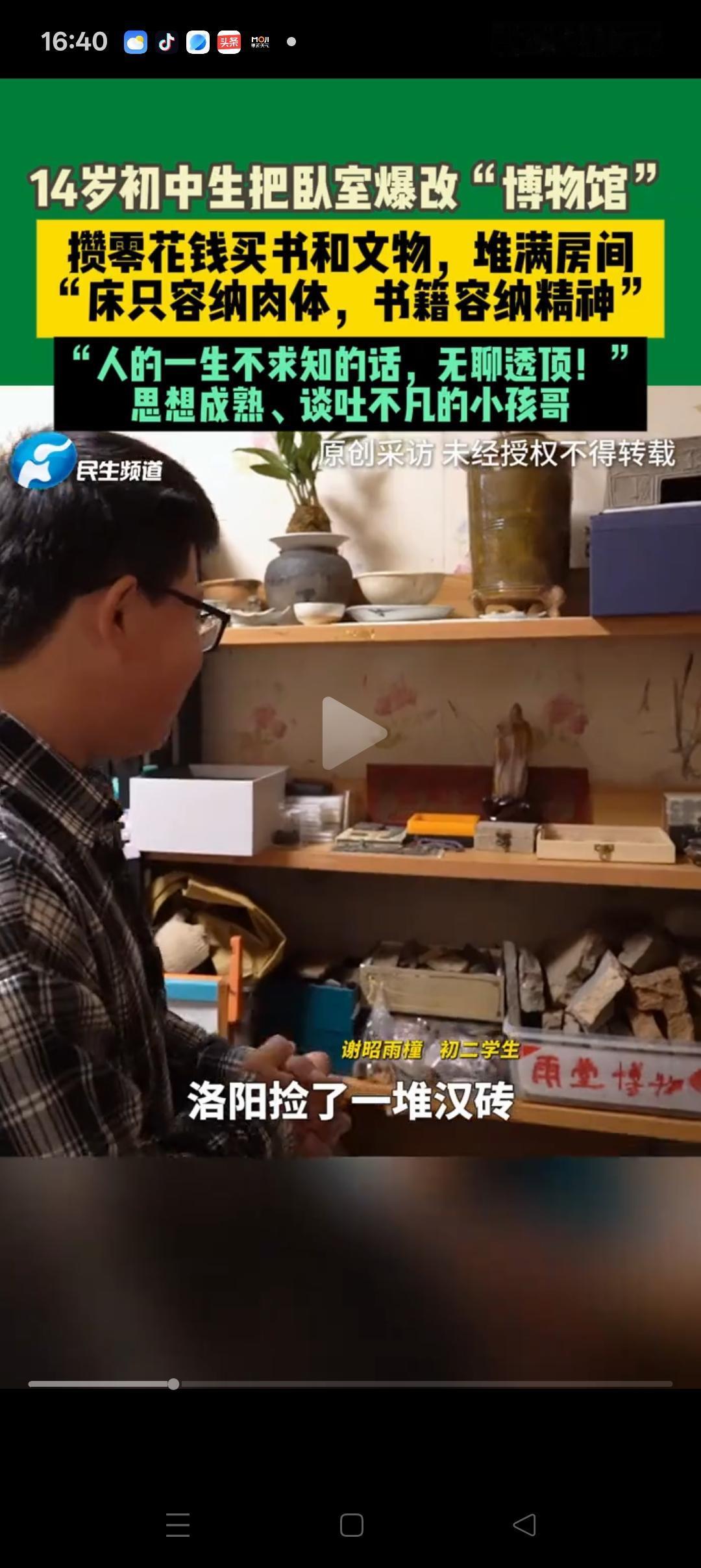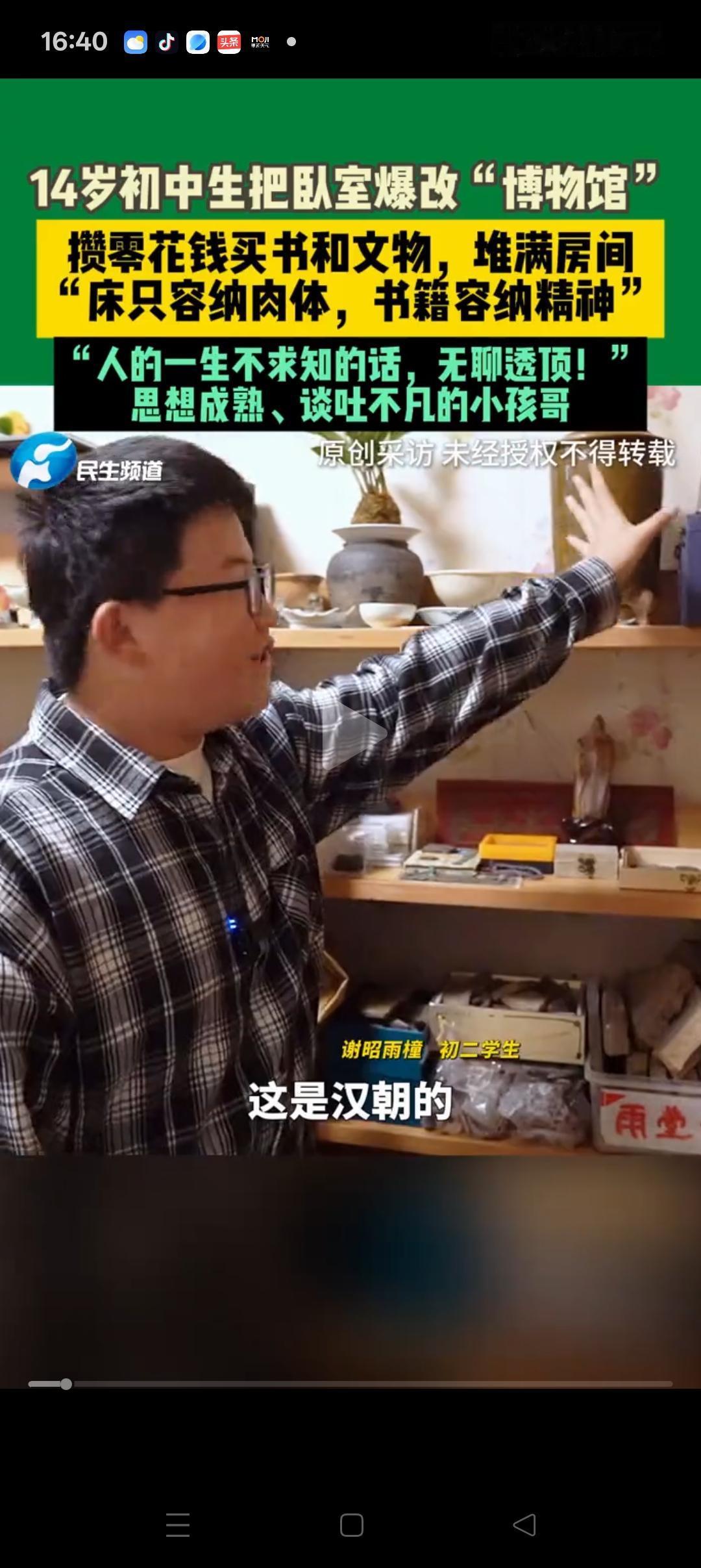 这男孩不得了,以后必有一番作为!河南,14岁的谢昭雨橦把自己的卧室改成了“博物馆”,里面放满了书籍和文物,有汉朝的,元代的,宋代的,但他的袜子虽然破了洞,依然舍不得换。 他还直言:你不必追求物质生活,这张床是容纳肉体的,剩下的东西,都是容纳我精神的[赞] 原来这些东西,都是他用妈妈给他的零花钱买的,坚持了很多年,妈妈也很无奈[呲牙] 看这个男孩的谈吐,气质,真不是一般人,年纪轻轻就有了清晰的逻辑和独立的思想。想必他的父母也是很优秀的人,才会有这么出色的孩子。。 即使他上不了清华,北大,有趣的灵魂也会让他的生活充实,快乐,羡慕啊[捂脸][捂脸]