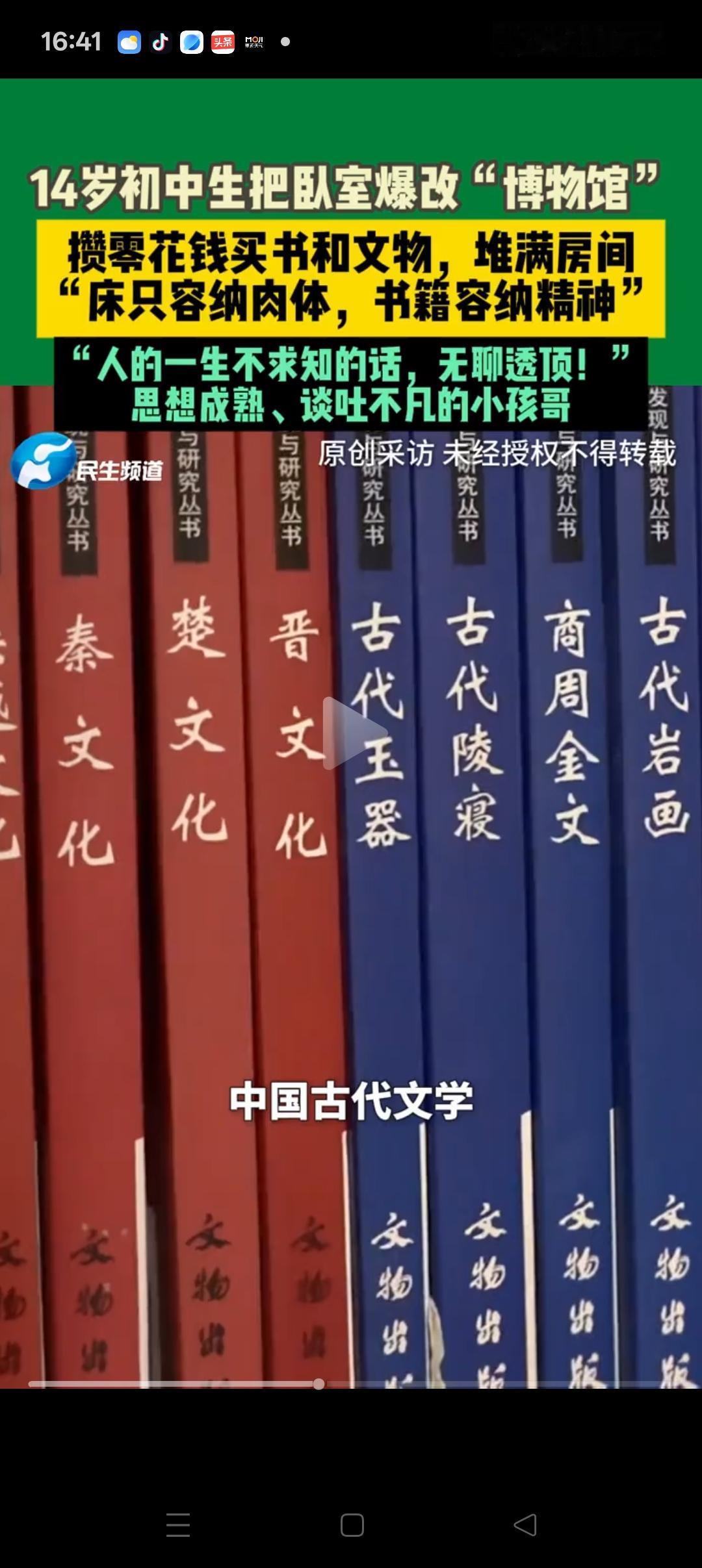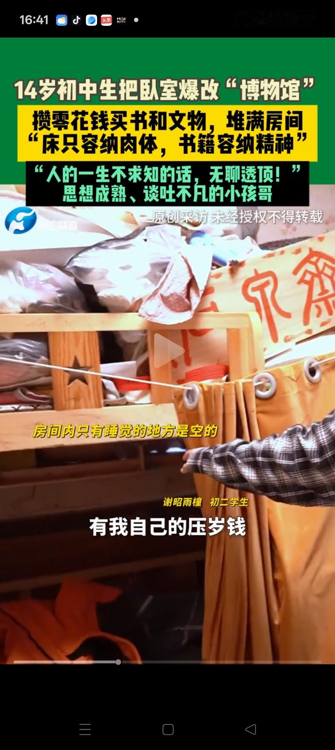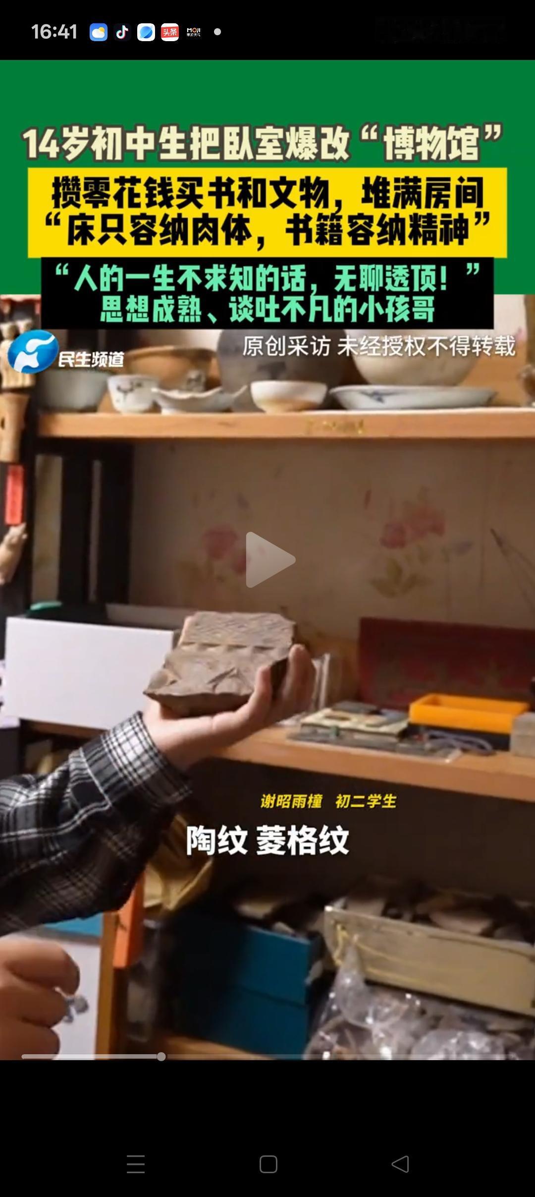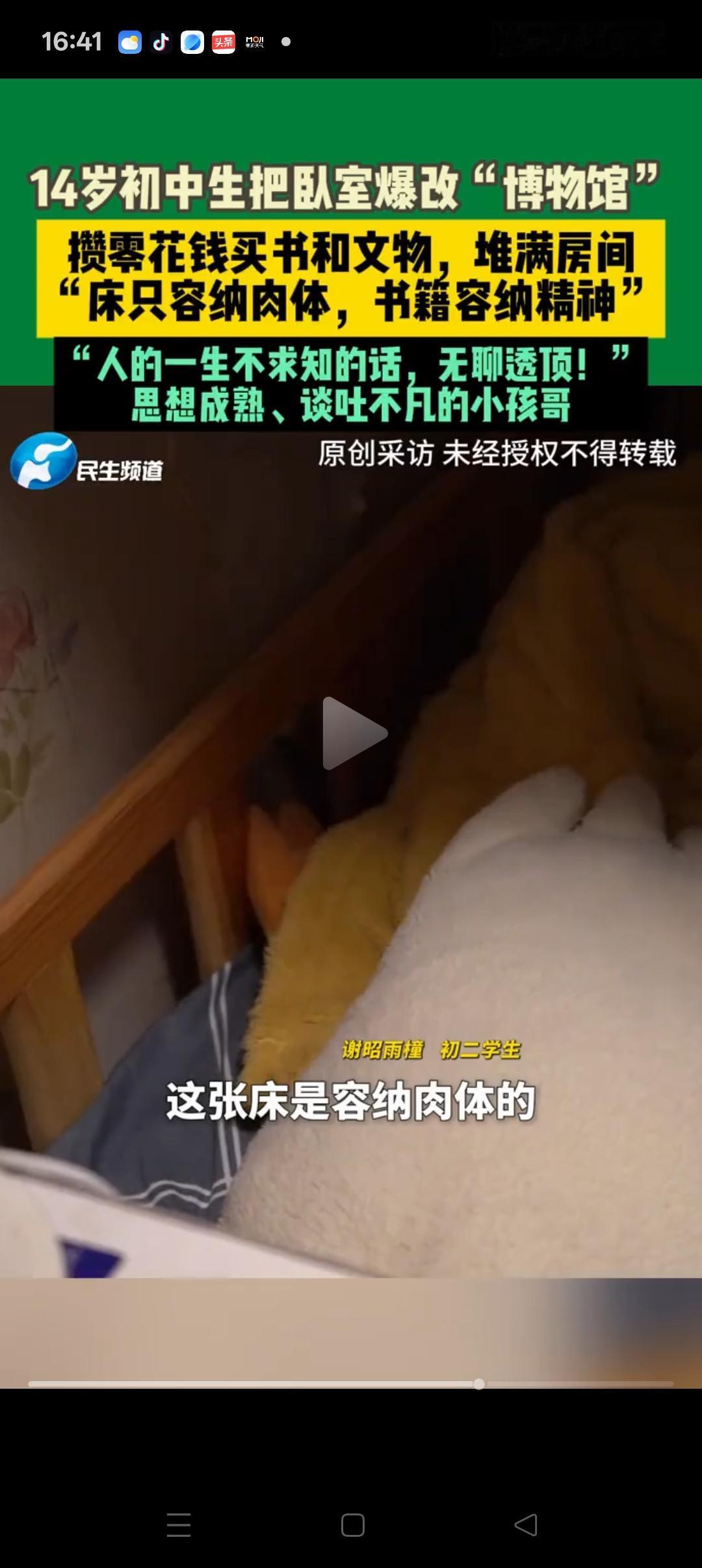 这男孩不得了,以后必有一番作为!河南,14岁的谢昭雨橦把自己的卧室改成了“博物馆”,里面放满了书籍和文物,有汉朝的,元代的,宋代的,但他的袜子虽然破了洞,依然舍不得换。 他还直言:你不必追求物质生活,这张床是容纳肉体的,剩下的东西,都是容纳我精神的[赞] 原来这些东西,都是他用妈妈给他的零花钱买的,坚持了很多年,妈妈也很无奈[呲牙] 看这个男孩的谈吐,气质,真不是一般人,年纪轻轻就有了清晰的逻辑和独立的思想。想必他的父母也是很优秀的人,才会有这么出色的孩子。。 即使他上不了清华,北大,有趣的灵魂也会让他的生活充实,快乐,羡慕啊[捂脸][捂脸]
