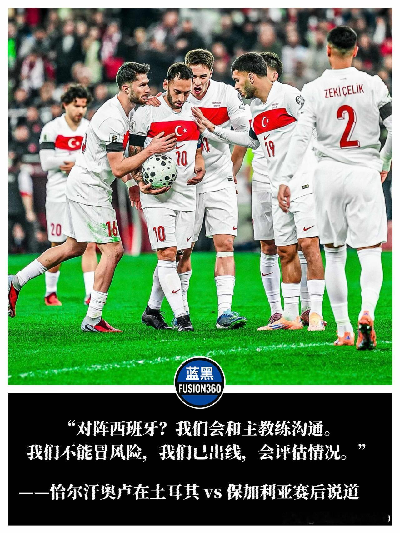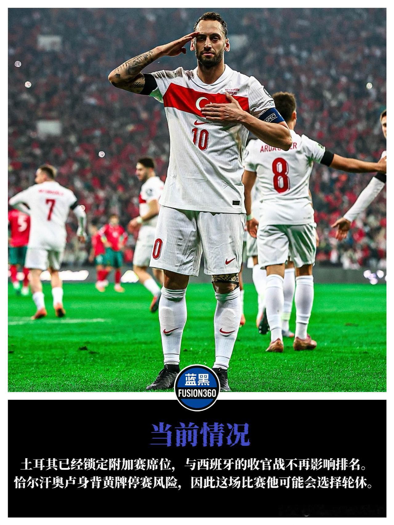 恰尔汉奥卢黄牌警告:或缺席西班牙战 昨晚土耳其对阵保加利亚的世界杯预选赛,恰尔汉奥卢主罚点球稳稳命中,帮助球队早早领先。场上他中场调度游刃有余,但也吃到一张黄牌,表情凝重地看了眼裁判。赛后他揉着腿部,走向替补席,似乎在盘算着接下来的风险。 恰尔汉奥卢赛后透露,将和主帅蒙特拉商量是否出战19号对西班牙的最后一场小组赛。他表示:“对西班牙的比赛?我们会和教练聊聊,不想冒风险,我们已经在小组前列,得评估情况。”因为如果再吃黄牌,他将缺席明年3月的附加赛,而土耳其已锁定附加赛资格,这场对西班牙基本无关痛痒。 这对国米来说是个好消息,恰尔汉奥卢能多休息几天,备战联赛复赛后的米兰德比,避免伤病隐患。 你觉得恰尔汉奥卢该冒险上场,还是安心回俱乐部养精蓄锐?国际米兰 💙🖤