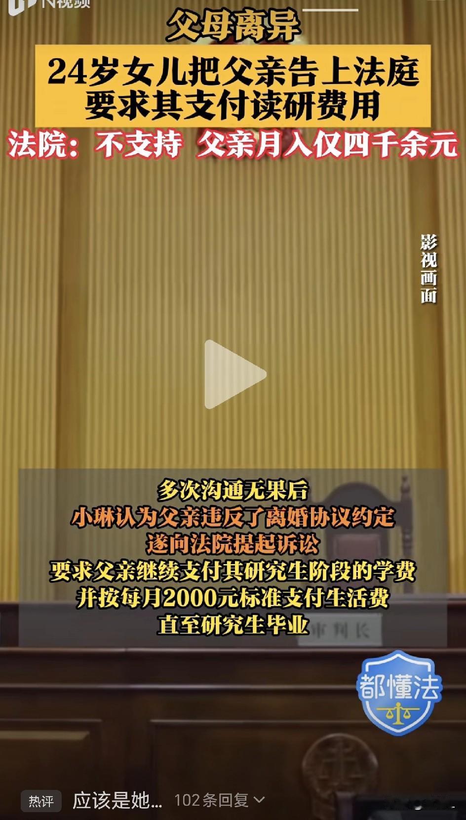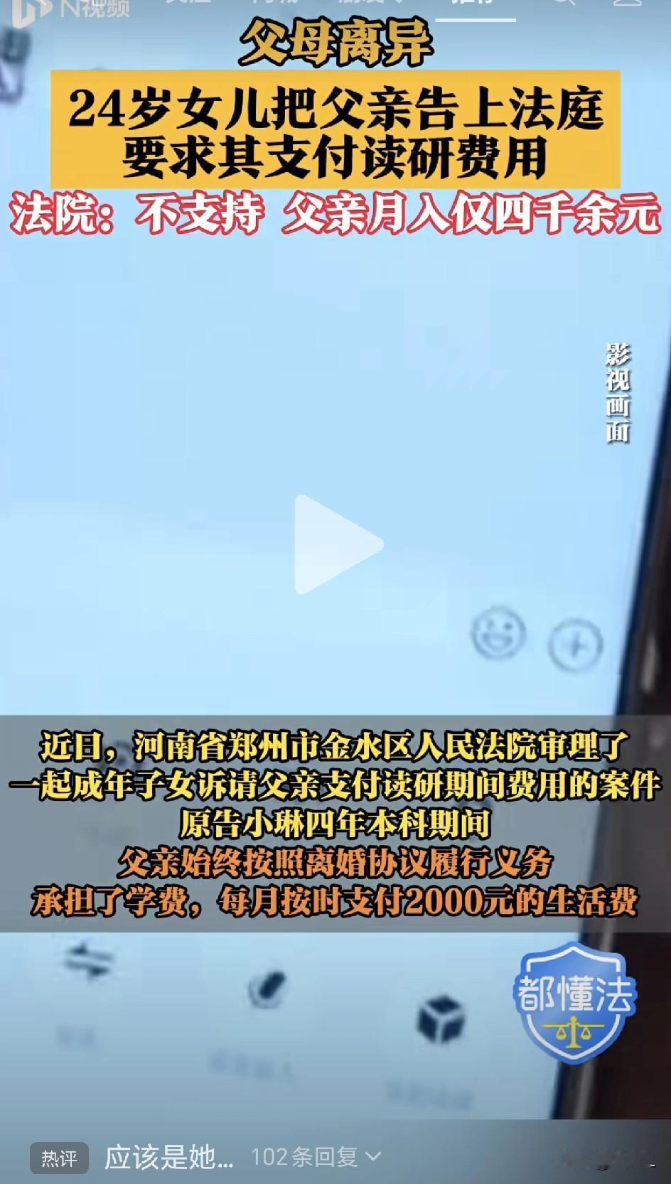 23岁研究生女儿将父亲告上法庭:给我出学费!法院判决结果亮了! 近日,河南郑州金水区人民法院审理了一起成年子女诉请父亲支付读研期间费用的案件。 原告小琳,18岁时,父母因为感情不和离婚。离婚时,约定小琳由母亲直接抚养,而小琳上大学时的学费则由父亲支付,并且父亲需要每月支付2000生活费。 在小琳的四年本科期间,父亲一直信守承诺,足额支付学费和每月2000元的生活费,完全覆盖了小琳的学习和生活所需。 2024年,小琳本科毕业后,选择继续攻读硕士研究生。 只是,父亲在支付了第一年研究生学费后,提出以后不会继续支付小琳的学费和生活费。理由是,自己的年事已高,现在挣钱不容易,而且23岁的小琳已经是成年人,研究生也不是义务教育,自己作为父亲已经承担了应尽的义务。 多次沟通后,父亲仍坚持自己的观点,小琳则把父亲告上了法庭,认为父亲违反了离婚协议约定,要求父亲继续承担自己研究生阶段学费以及每月2000元的生活费,直到自己研究生毕业。 但法院在经过调查发现,虽然父母离婚时,小琳已经年满18周岁,但出于父母对子女的养育责任,小琳的父亲在女儿四年本科期间,一直按照离婚协议承担女儿的学费和生活费。 只是小琳的父亲每月工资不过4000元,年龄也大了,对于女儿读研期间的学费和生活费实在无法继续承担。 父母为成年大学生支付抚养费的行为只是基于亲情和道义,而不是法定义务。 所以法院驳回了小琳的所有诉求! 但凡父母有那个经济能力,对于子女接受高等教育,一般都会竭尽所能去提供经济支持。这是亲情使然,但不能成为道德绑架的借口。 毕竟研究生不是义务教育,不是父母必尽的义务。 况且,读书深造,可以通过助学贷款、勤工俭学等等方式来解决自己的学费和生活费问题。 法律是底线,而非上限!法律规定了父母必须承担的最低责任,但家庭中的爱与付出远超出法律范畴。 子女在主张自己权利的同时,也必须理解并尊重父母的困难和权利。 在完成高等教育后,子女应该学会靠自己立足于社会,这是每个成年人的必修课。 小琳和父亲的故事在提醒所有家庭,在亲情与责任之间,需要的是沟通、理解与共同担当,而非单纯的法律强制。 信息来源于南方都市报,侵联删!