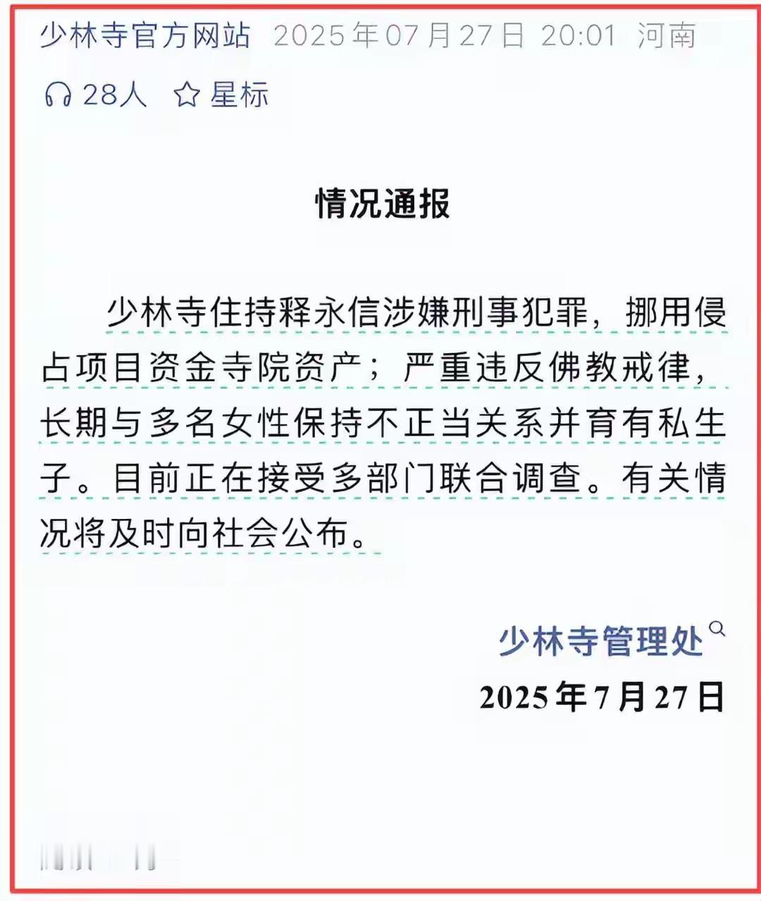 释永信被批捕! 11月16日消息,少林寺原住持释永信,经新乡市公安机关立案侦查,提请新乡市人民检察院批准逮捕。近日,新乡市人民检察院依法以涉嫌职务侵占罪、挪用资金罪、非国家工作人员受贿罪对释永信作出批准逮捕决定。 释永信是7月被带走调查的,过去这一段时间,新乡公安部门肯定做了大量侦查工作,掌握了确凿的证据。 从历次通报看,释永信被判多长时间,关键就在涉案金额。 一句话,没有所谓的法外之地。无论什么地方什么行业,都得遵守法律法规。对不对?释永信 操盘手释永信
