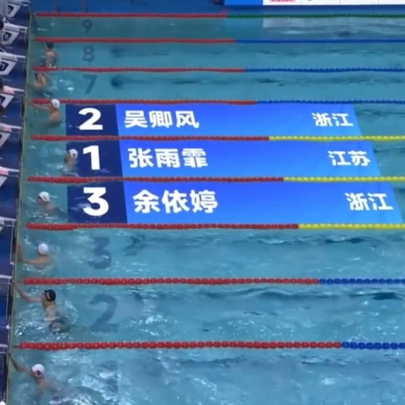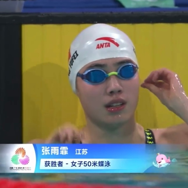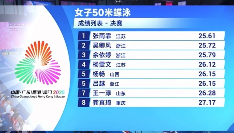 全运会女子50米蝶泳决赛,张雨霏以25秒61的成绩夺得金牌🏅,吴卿风银牌🥈,余依婷铜牌🥉