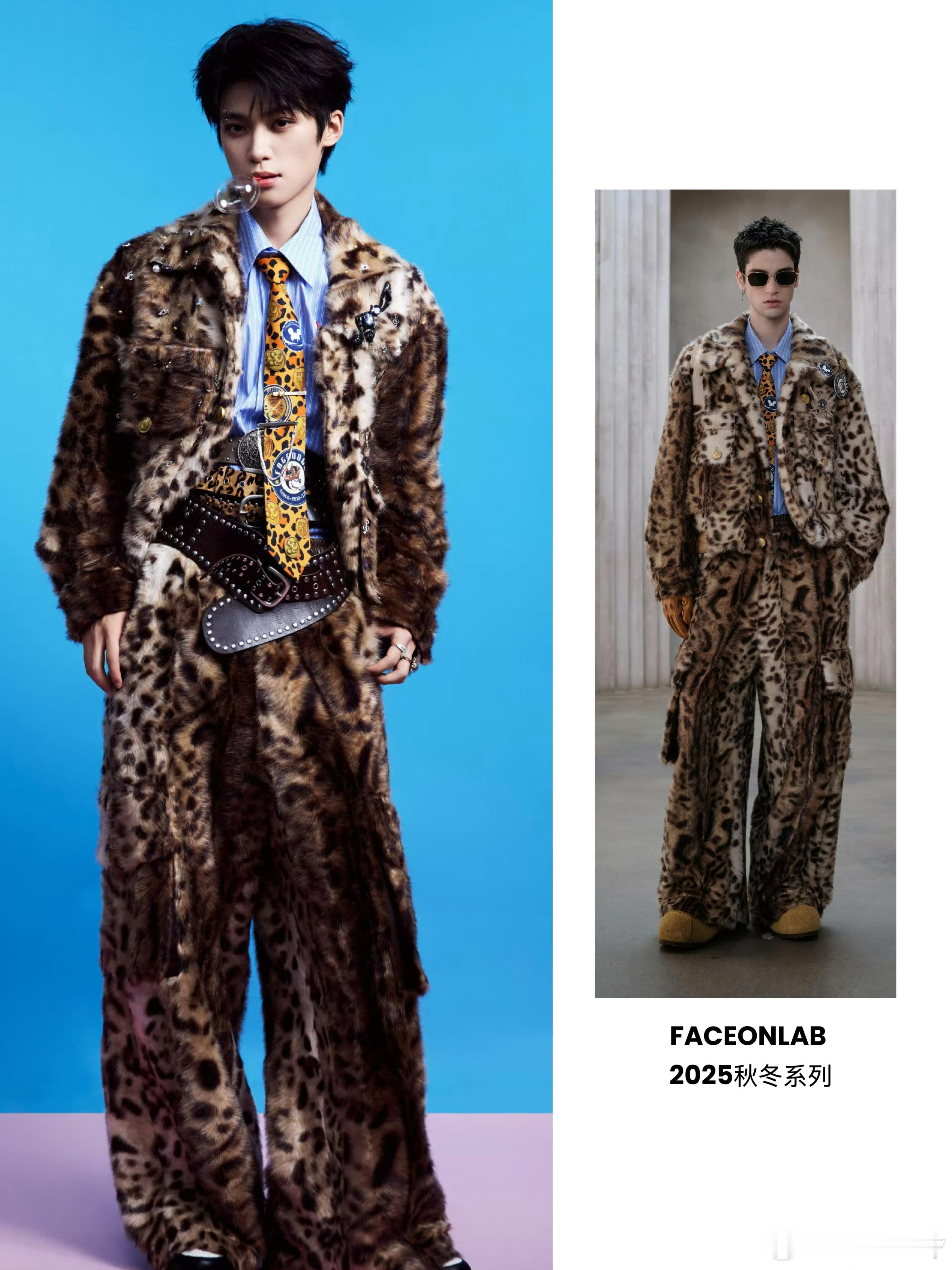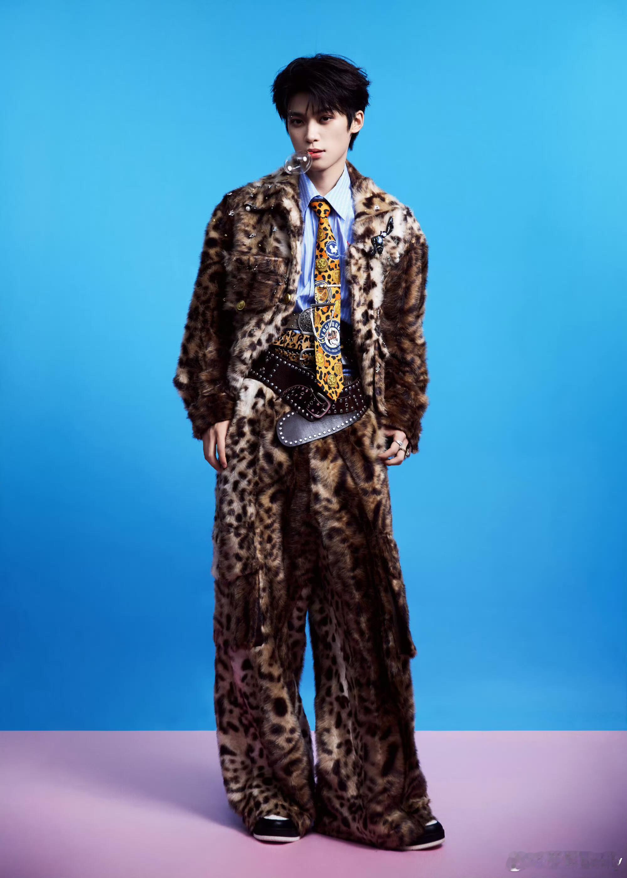 梓渝2025年杭州氧气音乐节梓渝以FACEONLAB 2025秋冬系列的豹纹毛绒套装亮相,内搭蓝衬衫与印花领带,在粉蓝撞色背景和彩色球体的衬托下,风格大胆又充满趣味,可爱的小猫咪!