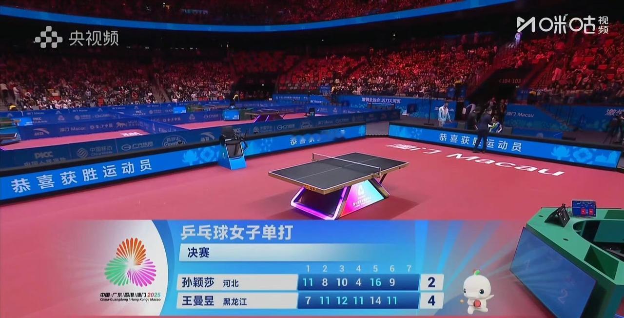 王曼昱卫冕全运会冠军[赞]! 王曼昱今天状态太好了! 第五局1-7开局打到爆分,第六局2-8开局,竟然逆转了! 刚刚!黑龙江队选手王曼昱4-2战胜河北队的孙颖莎,斩获2025年第十五届全运会乒乓球女单冠军,孙颖莎获得同样宝贵的亚军,六局比分为:王曼昱7-11,11-8,12-10,11-4,14-16,11-9。 第五、第六局的曼昱太顽强了,大逆风都给你追回来了。 第六局曼昱叫了个有效暂停,本来第5局就可以拿下了,打到第6局,落后那么多,估计曼昱场外教练的心都快跳出来了。 恭喜曼昱!今天确实曼昱状态更好,两位的比赛一直是最精彩的,期待更多交手!