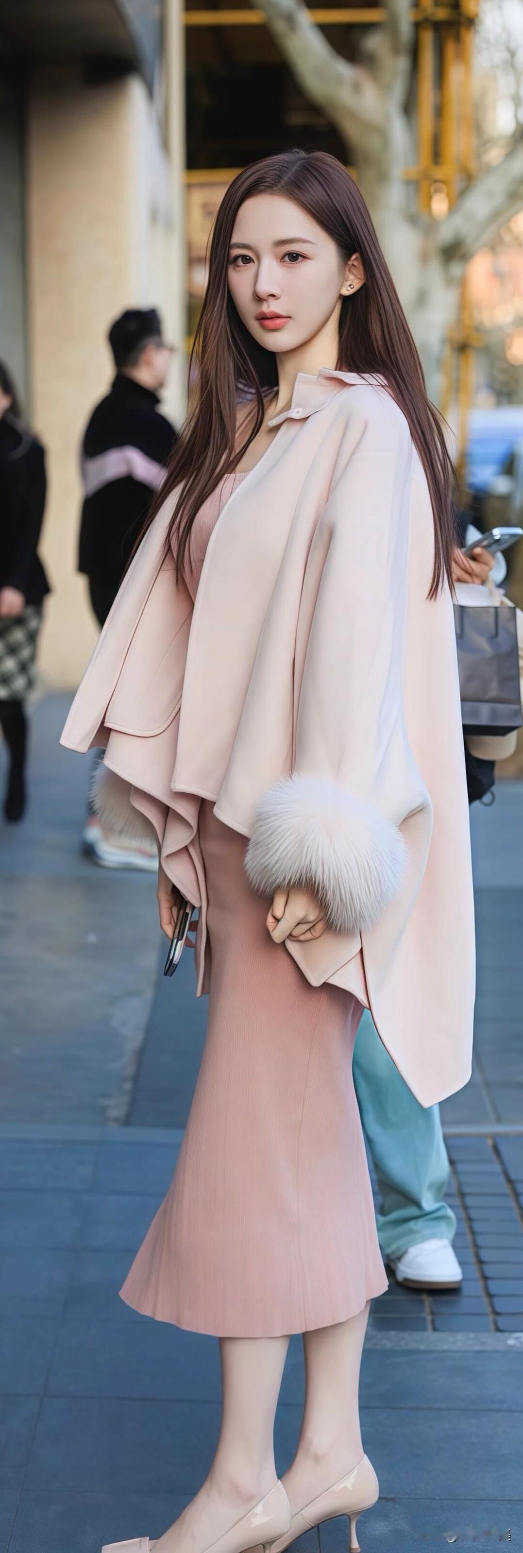 街头偶遇的粉色系穿搭好温柔!裸粉连衣裙配同色系带毛领外套,这一身温柔感直接拉满