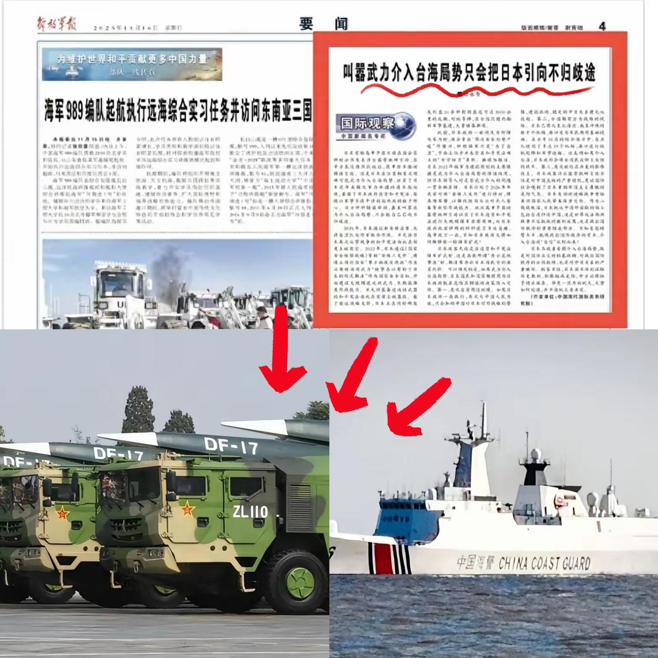 迄今最强硬警告!军报发文“日本全国或沦为战场”,同一天中方在钓鱼岛领海巡航! 高市早苗还在台海问题上大放厥词,《解放军报》直接戳破真相:敢武力介入,日本全国都可能沦为战场。这话可不是空穴来风,日本早把北海道到冲绳的数十个机场、港口改成军民两用,上个月联合演习就动用39个,明摆着是把民众绑上战车。 更关键的是,警告当天中国海警1307编队就开进钓鱼岛领海巡航,这可不是巧合,是实力背书。 咱们的中远程火力覆盖范围摆在这,那些军民两用设施,真到战时就是第一轮打击目标,日本根本没胜算。 别觉得这是“打嘴炮”,中国的警告从来都是说到做到。 台湾问题是红线中的红线,日本忘了二战教训还想玩火,只会引火烧身。 这种“文告+行动”的组合拳,既亮明了底线,也给了对方回头的机会。 不是我们好战,是绝不允许任何人触碰核心利益。