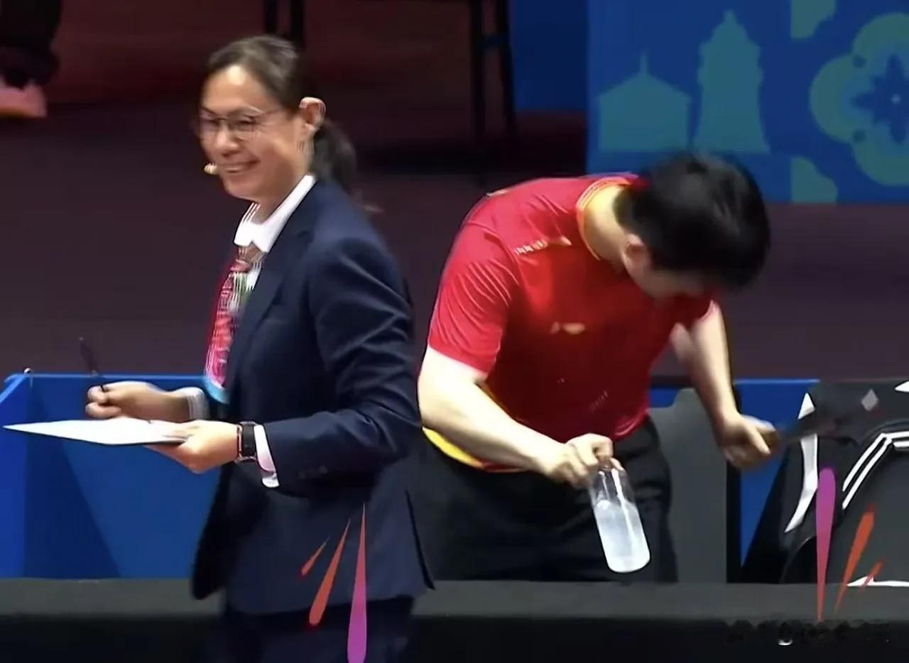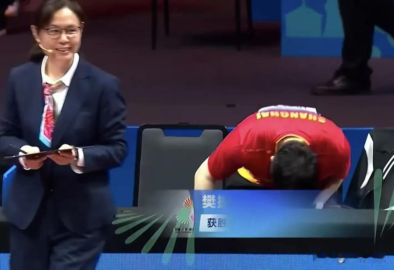 这个戴眼镜的女裁判绝对是樊振东的头号粉丝。 比赛结束,樊振东出于礼仪,要过来跟裁判握手致谢。 一开始这个裁判还装着很严肃的样子,后来找东哥签字的时候,表情就失去管理了,最后笑嘻嘻,很开心的走了。 小胖讨人喜欢,我在视频上看见他都会不由自主的笑意写在脸上,如果近距离见到他本人肯定也会激动! 樊振东的球迷粉丝遍天下,裁判是其中最特殊的群体,有机会近距离接触、观察他,比较煎熬的是,面对偶像工作怕分神!