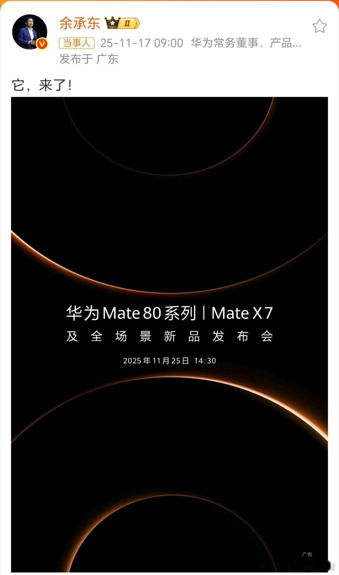 来了来了,这个男人他又来了!余承东微博官宣——华为Mate80发布会定档11月25日。网友评论:超越mate的只能是MATE。致敬无限探索的勇气!让我们一起期待华为Mate80,看看这次华为会给我们带来哪些惊喜!
