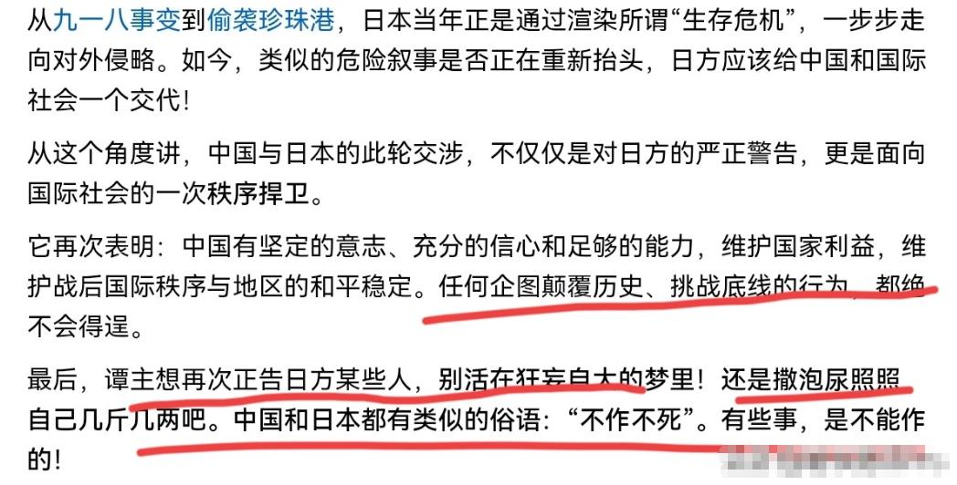 日本现在估计绷不住了!玉渊谭天再次撂话,警告日本某些人,还是撒泡尿照照自己几斤几两吧!11月15日,在高市早苗拒不撤回恶劣言论之后,玉渊谭天再次刊文表示,针对高市早苗的露骨挑衅言论,我们的忍耐,是有限度的。中方已做好对日实质反制准备,再次正告日方某些人,别活在狂妄自大的梦里! 高市早苗这波操作是真没摸准脉,放着好好的双边关系不管,非得跳出来说些露骨挑衅的话,好像嗓门大就能把中国吓住似的。 她大概是忘了,现在的中国早不是几十年前的样子,更不是日本军国主义横行时能随意拿捏的对象。 还敢提什么和中国 “打潜艇战”,这话要是放在几十年前说,或许还能让人心里咯噔一下,可现在说出来,除了让人觉得可笑,实在没别的感觉。 真要论水里的家底,中国 77 艘潜艇摆在那儿,不管是数量还是质量都够形成压制,日本那 23 艘常规潜艇,先不说远洋能力怎么样,单是配套的作战体系就差着一大截,真动起手来,能不能出得了港都得打个问号。 更别说中国海军的水面力量了,辽宁舰、山东舰早就在远海练过兵,福建舰的电磁弹射技术让多少国家眼热,最近海试的四川舰更是把远洋战力又提了一个档次。这四艘航母往这儿一摆,就是最硬的底气。 日本那些所谓的 “准航母”,说白了就是在驱逐舰基础上改的,连固定翼舰载机都没法正常起降,顶多算个 “直升机母舰”,真要碰面,连当陪练的资格都悬。 空军方面的差距就更明显了,中国光是歼 - 20 就有 300 架,整个现役战机队伍超过 2000 架,预警和电子战系统织成的网密不透风。 日本那 330 架作战飞机里,老旧机型占了一大半,F-35 的数量连歼 - 20 的七分之一都不到,真要是空中对峙,恐怕连中国战机的影子都没看清就得被锁定。 高市早苗敢说这种话,大概是被日本右翼的迷魂汤灌晕了,忘了日本现在的军事底子有多虚。 陆上自卫队满打满算才 13 万人,坦克就 500 多辆,远程火力根本拿不出手;中国陆军 13 个集团军,5000 辆现代化坦克随时能拉出来,合成化作战能力早就经过了检验。 更关键的是战略威慑力,中国火箭军的东风系列导弹,从近程到远程全覆盖,东风 - 17 的乘波体技术让拦截成为难题,东风 - 26 更是被称作 “航母杀手”,这种级别的威慑力,日本连边都摸不着。 他们连核武器都没有,远程导弹技术还得看美国脸色,真要是把中国惹急了,“东风快递” 的速度和精度,会让他们彻底明白什么叫实力差距。 别光说军事,日本的国防工业更是经不起扒。核心技术大多依赖美国,想造点先进装备,关键部件都得从国外进口,石油、铁矿石这些基础资源几乎全靠海外运输,一旦供应链出点问题,军工生产线就得停摆。 中国呢?全产业链自主能力摆在那儿,从战机航母到导弹芯片,都能自己造,基础材料储备充足,不管是战时动员还是持续作战能力,都不是日本能比的。 200 万现役军人加上庞大的动员潜力,对比日本那 24.7 万自卫队,谁的底气更足一目了然。 玉渊谭天这话可不是喊口号壮胆,中方既然敢说做好了实质反制准备,那手里肯定攥着能让日本疼的招。日本的汽车、电子这些支柱产业,多少都依赖中国市场,真要是动起手来,这些行业首先就得承压。 更别说中日贸易里那些关键的原材料和零部件,中国要是收紧供应,日本不少工厂都得面临停产风险。 高市早苗大概是觉得有美国撑腰就万事大吉,可美国自己都一堆麻烦,真到了关键时刻,能不能靠得住还两说,她倒好,先把自己国家的利益绑上了战车。 日本军国主义那点贼心,从来就没真正死过,总想着翻旧账、搞小动作。可时代早就变了,当年那种靠着坚船利炮就能横行霸道的日子一去不复返了。 现在的中国,既不惹事也不怕事,你好好说话,咱们能坐下来谈合作;你要是非要挑衅,那也别怨中方不客气。高市早苗要是还拎不清,继续在错误的路上走下去,迟早得把日本拖进麻烦里。 中方的警告已经说得够清楚了,别活在狂妄自大的梦里。真要等反制措施落地,日本再想回头就晚了。 到时候别说是高市早苗,就算是日本政坛那些想搞小动作的人,都得掂量掂量自己能不能扛得住后果。 毕竟实力差距就摆在那儿,嘴硬解决不了任何问题,真要比拳头硬,日本还差得远呢。 现在收敛还来得及,要是非要一条道走到黑,那最后只能是自食恶果,没人会为他们的狂妄买单。 参考资料:中国新闻网《玉渊谭天:中方已做好对日实质反制准备》
