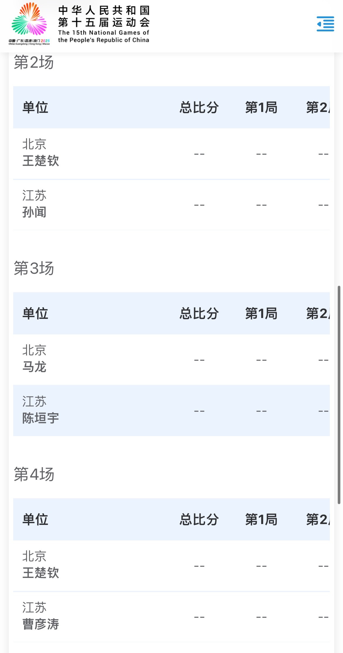 20251117|第十五届全运会团体赛对阵男子团体小组赛-A组T1北京VS江苏第二盘王楚钦VS孙闻第四盘王楚钦VS曹彦涛王楚钦比赛加油加油加油加油