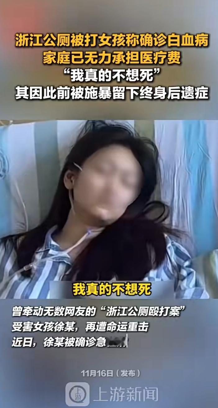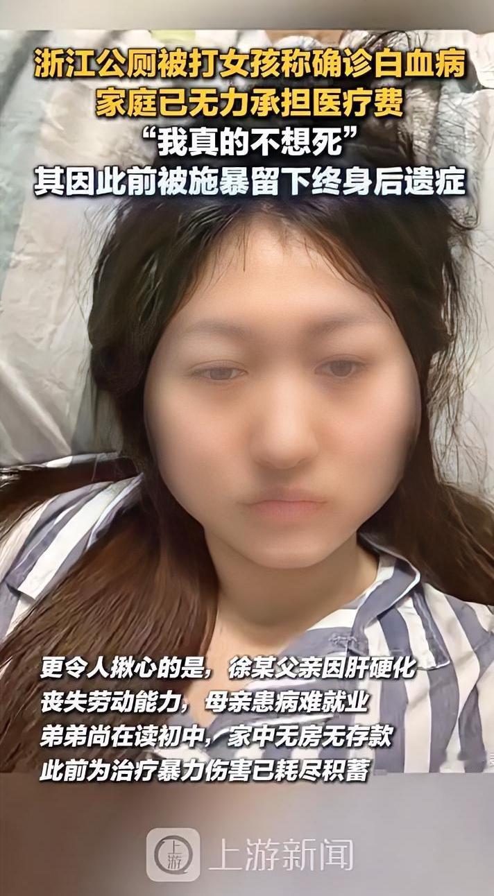 善良女孩遭遇暴力与病痛,社会还能温暖吗? 浙江公厕殴打案‌受害女孩徐某(22岁)近日确诊‌急性淋巴细胞白血病‌,需四五十万元骨髓移植费用,其家庭因父亲肝硬化、母亲患病无力承担。2022年她曾遭俞某殴打致重伤,赔偿款已用于前期治疗。‌‌ 在这个充满温情与冷漠交织的社会里,令人心碎的故事总是不经意间触动我们的心弦。22岁的徐某,本应拥有一个充满希望的未来,却因为一次意外的暴力事件,陷入了生命的危机。她曾在公共场所遭遇殴打,那一刻的无助与痛苦,或许只有她自己知道。而如今,命运再次对她开了个残酷的玩笑:被诊断出急性淋巴细胞白血病,急需四五十万元的骨髓移植费用。 这个数字,看似遥不可及,却真实地摆在了她的面前。更令人心碎的是,她的家庭早已举步维艰:父亲肝硬化,母亲身体状况不佳,根本无力承担如此巨额的医疗费。曾经的伤痛还未愈合,又要面对生命的巨大考验。或许有人会问,为什么偏偏是她?为什么在这个社会的角落里,善良的女孩会遭遇如此不公?答案或许比我们想象的更复杂,但无论如何,我们都不能对这样的悲剧视而不见。 更令人愤怒的是,2022年,她曾因被俞某殴打致重伤,赔偿款也已花费在前期的治疗上。一次次的伤害,一次次的痛苦,似乎都在告诉我们:社会的某些角落,依然充满着冷漠与不公。而我们,又能做些什么呢?是继续漠视,还是站出来,为这些无助的生命发声? 这不仅仅是一个个体的悲剧,更是一个社会的缩影。它让我们不得不反思:我们身边的“冷漠”何时才能变成“关怀”?我们是否还能在繁忙的生活中,留下一点点时间和温暖,去关心那些需要帮助的人?每一个生命都值得被尊重,每一个伤痛都不应被忽视。 或许,最令人心碎的不是疾病本身,而是我们是否有能力去改变这份无助。希望所有看到这篇文章的人,都能用自己的行动,去点亮那些暗淡的角落。因为,社会的温暖,从每一个愿意伸出援手的人开始。让我们共同期待,有一天,像徐某这样无助的生命,不再孤单,不再被命运锁左右,而是被爱和希望包围。殴打伤人