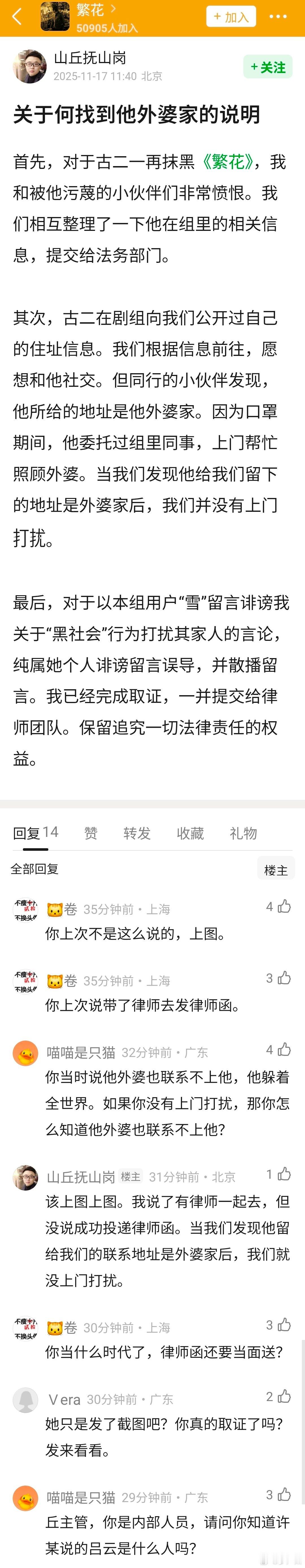 繁花宣传主管丘某回应给古二外婆发律师函,痛斥网友“诽谤”“造谣”,称已经保存证据。