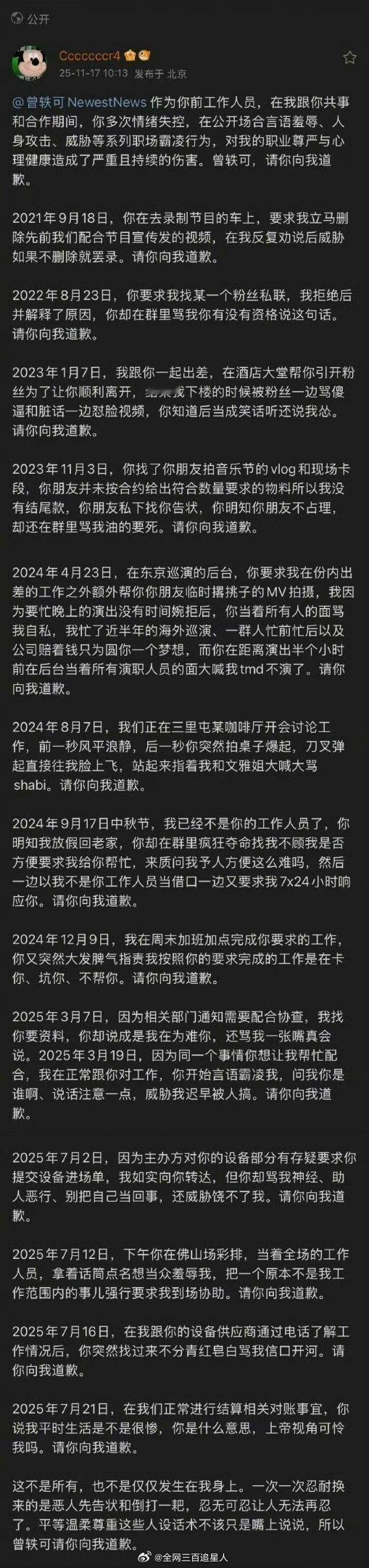 朋友们你们看到曾轶可前工作人员发的这个吗!?中间好像是离职又回去了还是咋,24年9月份已经不是工作人员了但是后续也一直在给她干活,但是被骂如狗,以前还羡慕过圈内人,现在发现其实艺人身边的也都是一样的打工仔,碰上脾气不好的更是倒霉仔