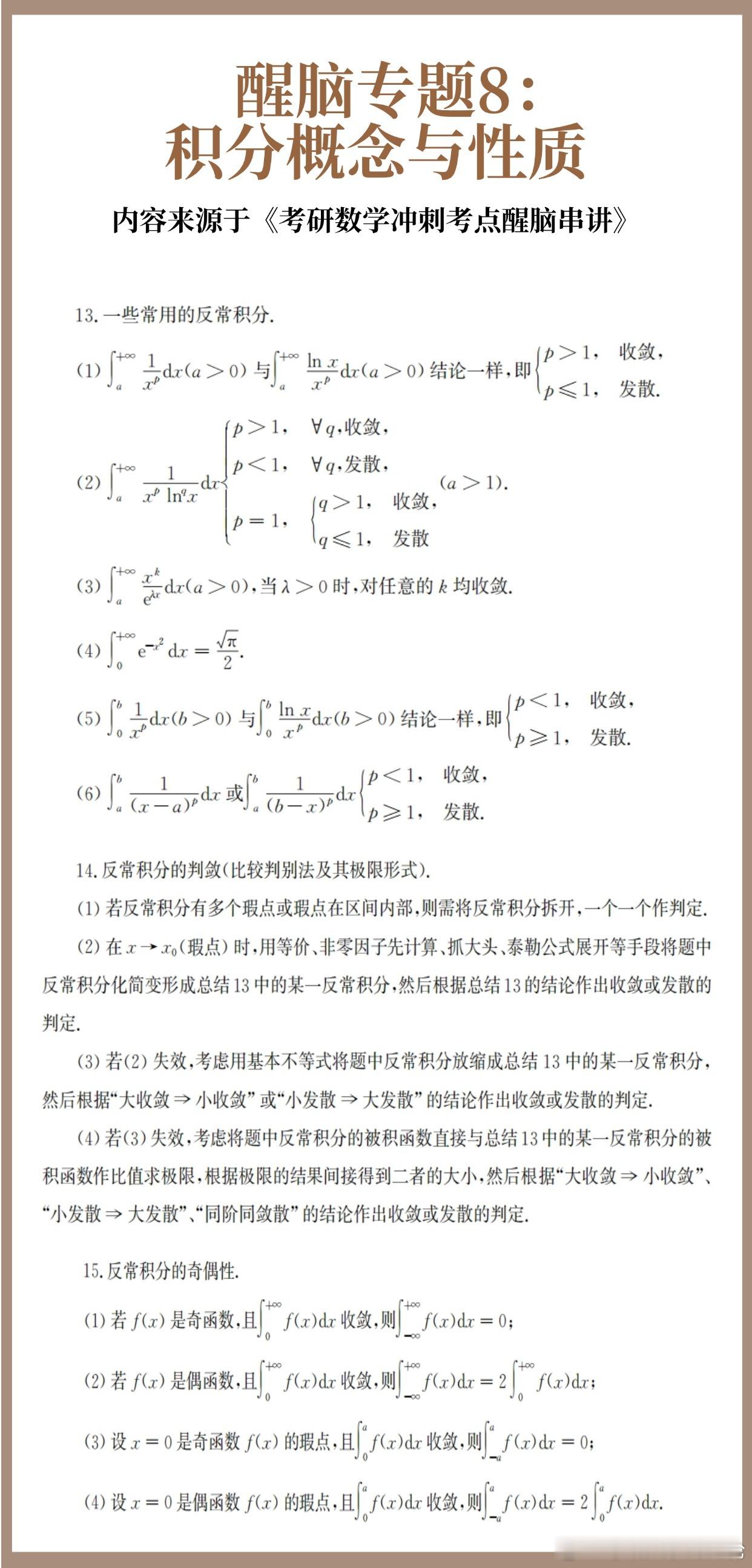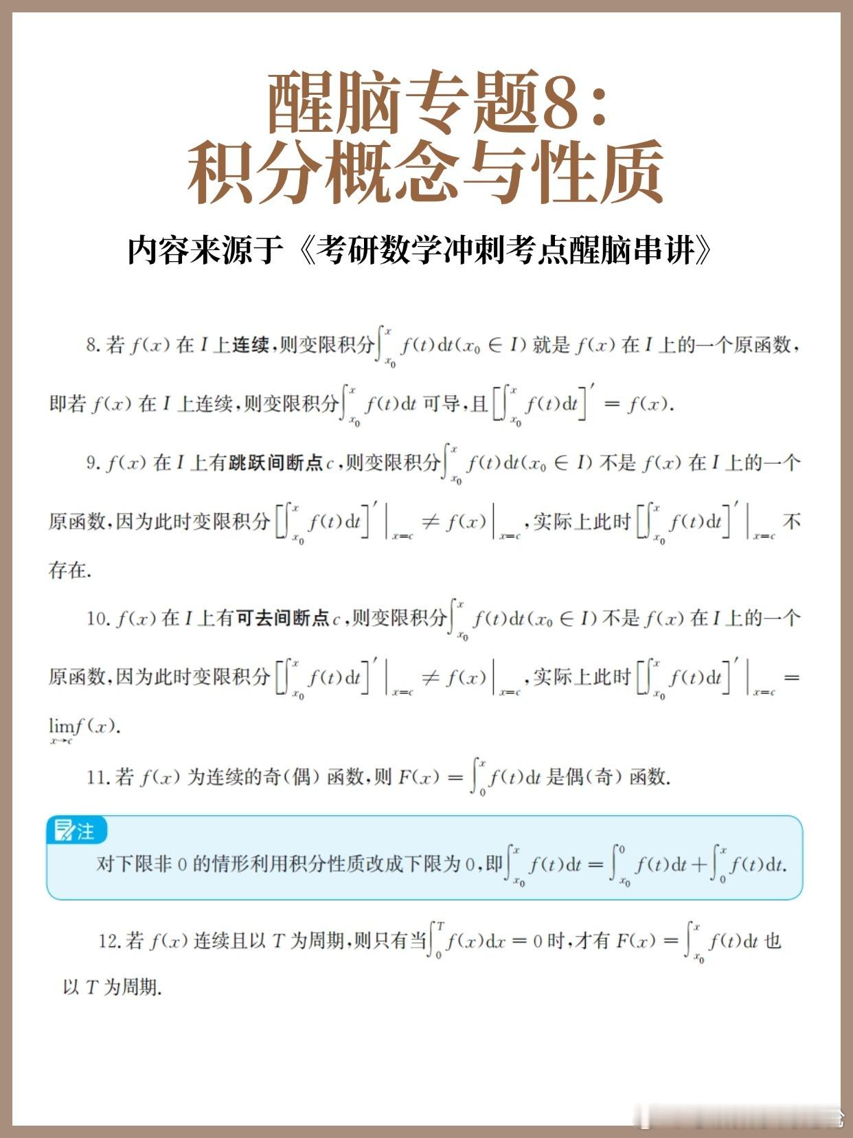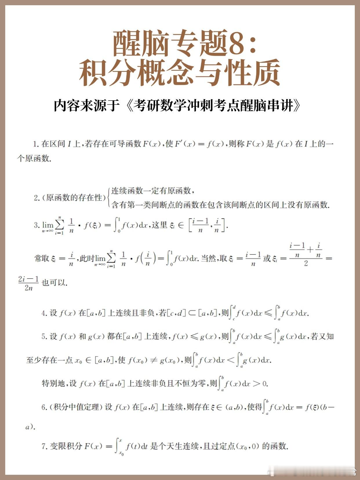 考研数学30天急救计划!【醒脑专题8】:积分概念与性质30天30个核心专题,把数学重要的公式和考法总结回顾一遍!每天背一背,写一写,不负过往,终将上岸!