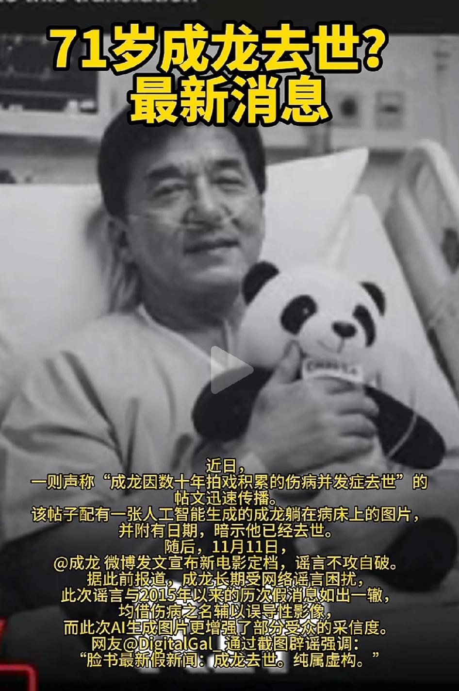 71岁成龙去世? 一则声称“成龙因数十年拍戏积累的伤病并发症去世”的帖子迅速传播 成龙:我也不知道自己死多少次了。此次的谣言与历次假消息如出一辙。如果信息是假,就是缺德,就要严逞!不过上次有人造谣说杨振宁走了,然后第二天就真走了 前段时间也是说有人造谣谁去世了。好多辟谣的。说是假消息。过两天后真的去世了。