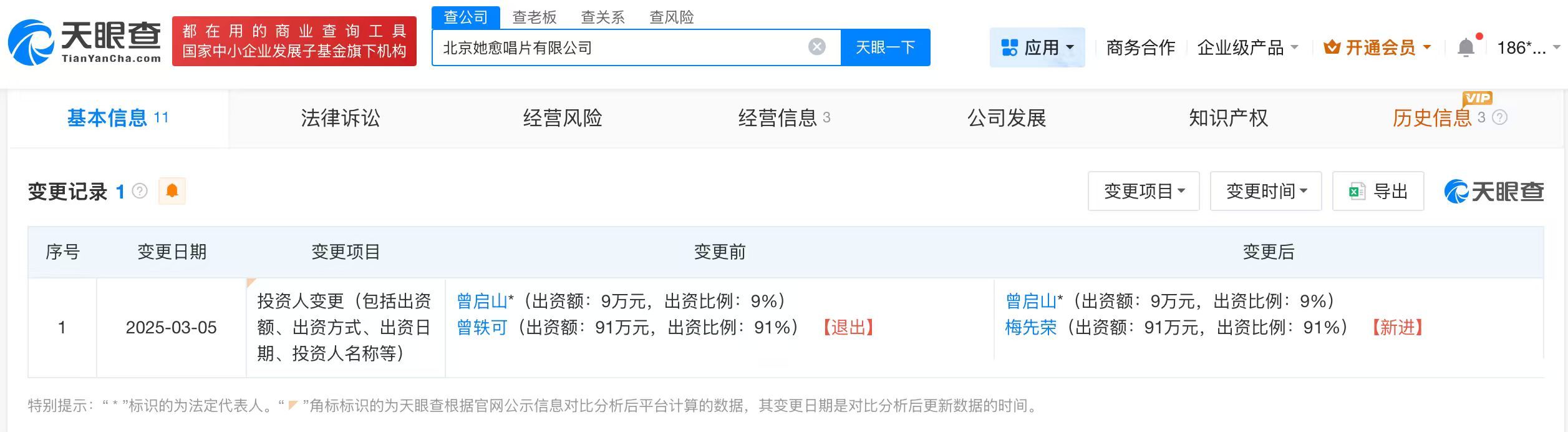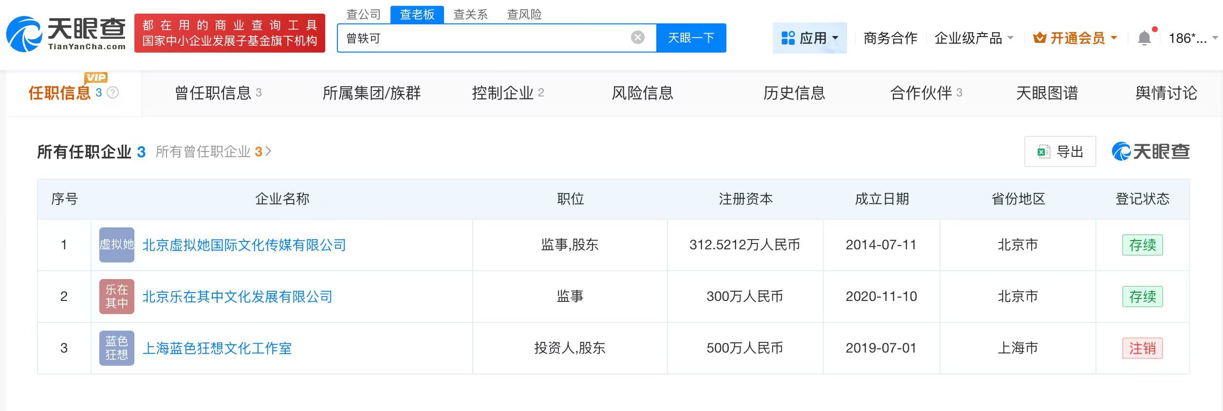 天眼查App显示,曾轶可名下共关联3家企业,其中2家为存续状态,分别为北京虚拟她国际文化传媒有限公司、北京乐在其中文化发展有限公司,曾轶可在上述公司担任监事等职务。此外,今年3月,曾轶可刚退出北京她愈唱片有限公司股东行列,退出前持股91%。11月17日,有网友自称是曾轶可前工作人员,其发文控诉曾轶可职场霸凌并要求道歉。随后,曾轶可现任助理在朋友圈公开质问前工作人员。