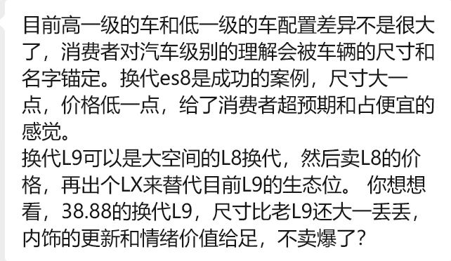 大家评评理:目前高一级的车和低一级的车配置差异不是很大了,消费者对汽车级别的理解会被车辆的尺寸和名字锚定。换代es8是成功的案例,尺寸大一点,价格低一点,给了消费者超预期和占便宜的感觉。换代L9可以是大空间的L8换代,然后卖L8的价格,再出个LX来替代目前L9的生态位。 你想想看,38.88的换代L9,尺寸比老L9还大一丢丢内饰的更新和情绪价值给足,不卖爆了?