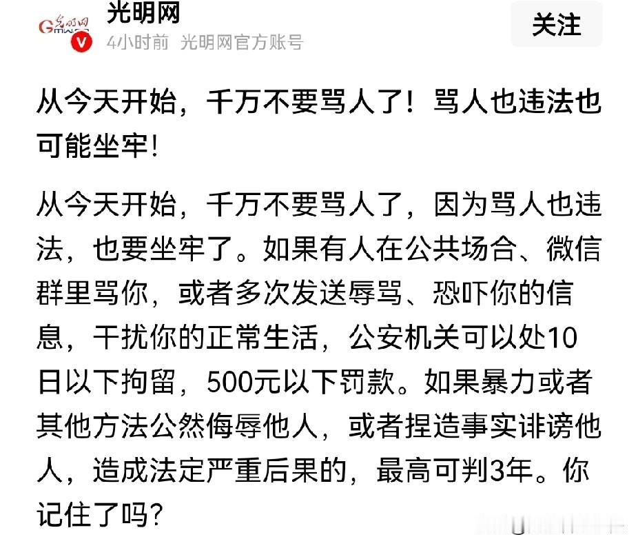 从今天起,不能再轻易去骂人了,因为这样的行为,属于违法行为,不仅罚款,可能还要拘留! 这是光明网发的,这是新闻吗?公共场所辱骂他人,扰乱公共秩序本来就违法啊!为啥说是从今天开始呢? 有一点需要注意,微信群内也不能骂人哦,那些火爆性子得忍一忍啦!哈哈!不过话说回来,遇到那些该骂的,实在忍不住怎么办呢?难道还能让他嚣张下去?不骂人的方法