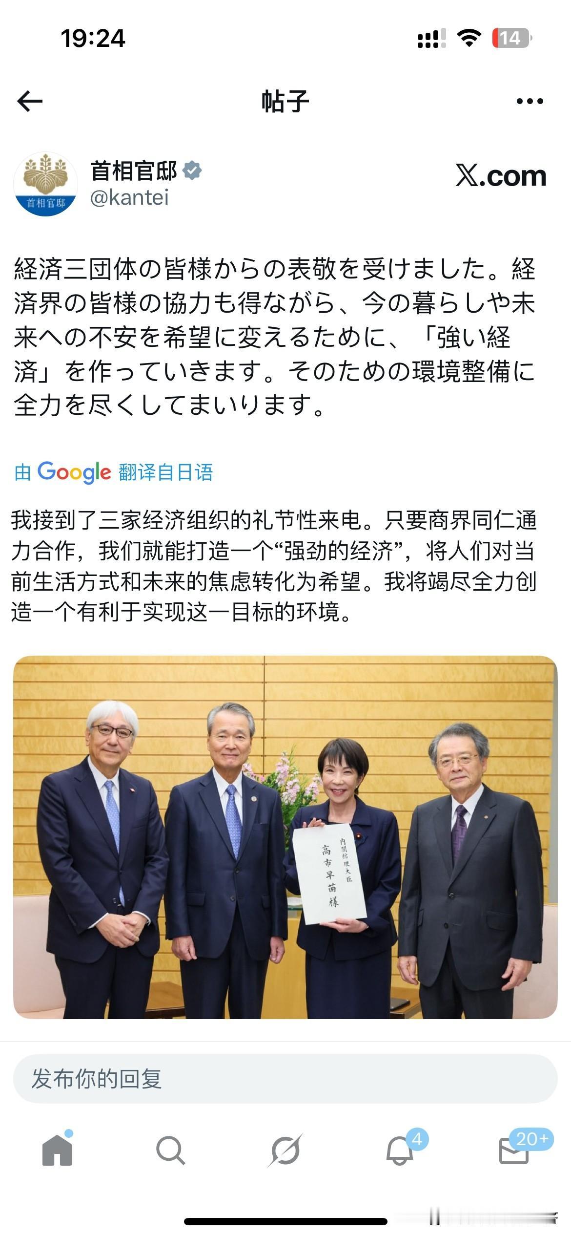 日本首相官邸官方账号发文: 高市早苗接到了三家经济组织的礼节性来电。只要商界同仁通力合作,我们就能打造一个“强劲的经济”,将人们对当前生活方式和未来的焦虑转化为希望。我将竭尽全力创造一个有利于实现这一目标的环境。