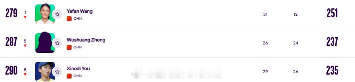 最新一期中国大陆球员WTA单打世界排名TOP30024.郑钦文57.王欣瑜102.张帅129.袁悦163.朱琳169.郭涵煜175.王曦雨180.高馨妤206.韦思佳227.马烨欣279.王雅繁287.郑妩双290.尤晓迪