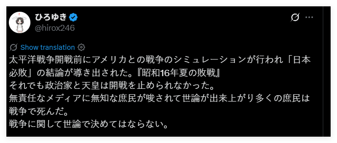 我来说说现在高市捅娄子之后现在事情的整体进展吧。总之一个词:好。不是说舆论支持我们的意思,这个不用幻想。但是,由于中方不断发声以及做出反制,现在外面关于高市早苗挑起的这波中日碰撞的焦点,已经完全从薛剑总领事说过什么话,转入了中日此次冲突的根源:台湾问题以及背后的历史问题。而在这个问题上,无论日本还是支持日本的喷子怎么叫嚣,中方官方账号在这个问题上早早就把用国际法打造的铁一般的立场立在那了,换句话说,对方已经进入了我方用阳谋预设好的战场了。法理上我方出师有名不动如山,那么对方就变成了不讲事实的意识形态站队,就变成了赤裸裸的用实力说话,就变成在台湾问题上,日本后面还能加上谁的问题。有两个转发四位数的热帖我印象很深,一个是长期支持中国的美国账号,说台湾属于中国,高市“威胁要就台湾问题与中国开战”,让很多日本人破防,只能攻击他的左翼立场,想用意识形态把他灭了;还有一个中国人发的贴,说如果日本胆敢介入台湾我们会做好核战争的准备,评论区有一条非常有意思,美国人A用意识形态叫骂说威胁谁呢信不信我们美国先灭了你,结果另一个持美国优先立场的美国人B冲出来说,简直疯了,我们怎么可能冒着美国城市被毁灭的风险去为万里之外的日本打核战争。于是两个MAGA吵了起来……所以,在那些拉帮结派跟中国开战的自嗨帖下面,攻击恐吓中国的日本人美国人东欧人,都要回答一个问题,美国政府到底会不会真的军事介入? 我们知道,这两天美国国内的大事就是阿川与MTG决裂,原因就是有MAGA觉得阿川已经不够美国优先了,他们甚至反对阿川为了以色列炸伊朗,更何况台湾、日本了。有不少人奇怪,阿川在台湾问题上都不去招惹中国,你日本为啥突然跳出来搞事?阿川甚至在回答中日这次冲突时,说出盟友不一定是朋友这种话。关于阿川我说过,因为现在美国从总统到下面所有官员的礼崩乐坏,让各个国家进入了随便折腾国际关系的自由王国。高市早苗这个任性疯批的做派,其实也是在学阿川,走为复兴日本死而后已的人设,但这次怎么这么快捅了这么大的篓子?日本媒体一篇吹捧她的报道说漏了嘴:说高市不喜欢照本宣科,要把幕僚准备的八股都要改一遍,所以才会一天睡两个小时,其中,就包括这次引爆中日直接冲突的发言……要知道,阿川这么乱说话,背后有美国的实力,而且也都柿子找软的捏,比如日本。而高市这么乱说话,背后有啥?而且挑衅的还是中国。今天有一条新闻,日本第三季度GDP年化下降1.8%,上次评论高市为何引发中国愤怒的美国学者就说,特朗普的关税正在杀伤日本。对于中国对日本发出旅游警告,很多支持跟中国开战的日本人口嗨说,太好了,正想把中国游客赶出去呢,但这位美国学者转发了一个数据:8月来日的300多万外国游客中,100万来自中国,20万来自中国香港,而这都是因为石破茂让中日关系回暖的结果。还有一条新闻,根据共同社上周日的民意调查,48%的日本人支持与中国为台湾问题开战,44%反对。对于这样的结果,日本超级大V(粉丝比MTG都多)2ch创始人西村博之评论:“太平洋战争开战前,日本怎么模拟对美战争,结果都是'日本必败'。但政客与天皇仍让战争爆发。不负责任的媒体煽动无知民众,形成了舆论,最终结果是无数民众在战争中丧生。所以战争的事,绝不能由舆论来决定。“二战后,有日本人懊恼的说,是美国人请君入瓮,让日本一步步走上了偷袭珍珠港对美国开战的死路。希望今天,有聪明的日本人,也能想起当年这段历史教训。