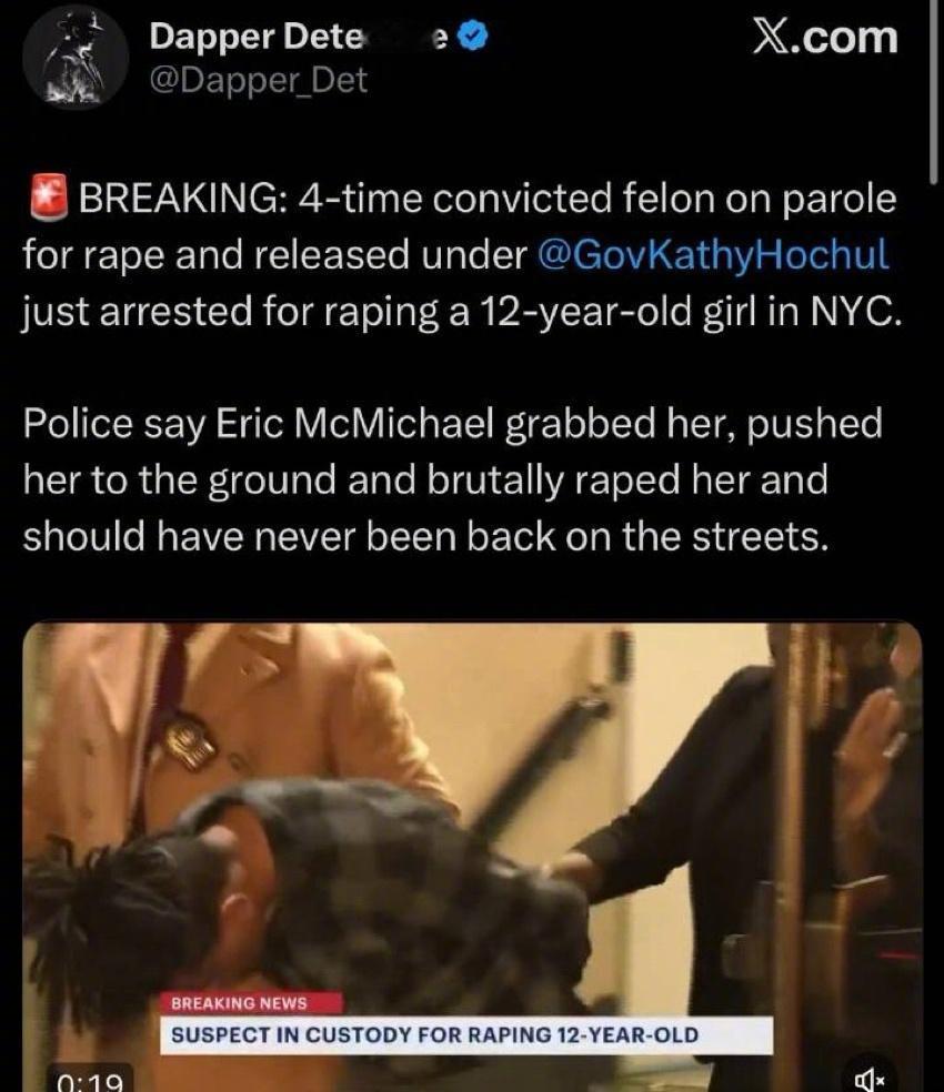布鲁克林男子楼梯间强奸12岁女孩,曾有多起重大犯罪前科,但都被释放。 11月6日下午,纽约布鲁克林发生一起性侵案件,一名男子尾随一名12岁少女进入东威廉斯堡(East Williamsburg)的大楼内,在楼梯间侵犯对方。 嫌疑人抓住女孩,威胁说如果女孩不跟他进入楼梯间就开枪打死她,随后在楼梯间实施强奸并逃离现场。 警方在隔日逮捕一名有前科的嫌犯,控以数罪。 7日上午警方公布监视器画面拍摄到的嫌犯照片,呼吁民众提供线索。当晚27岁的马麦克(Eric McMichael)便在其绿点(Green Point)的住处遭到逮捕。 面对媒体提问,马麦克全程弯腰低头不愿露面,沉默地被警方带走。 纽约市警局(NYPD)指出,嫌犯被控两项强奸与入室窃盗罪、两项性侵犯罪,以及危害儿童福利罪。 并且麦克迈克尔曾有四项犯罪记录。包括在2019年曾犯下强奸案与入室盗窃罪,2023年则被控犯有重大窃盗罪和抢劫罪。但都被释放。 2019年因强奸罪被定罪; 2019年犯入室盗窃罪; 2023年因重大盗窃和抢劫罪被定罪。 根据警方数据,该事件发生的第94分局辖区今年的强奸案件数较去年略微下降,但全市同期案件则上升了18%。