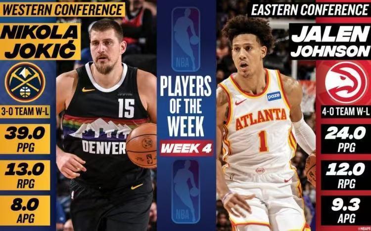 NBA官方宣布,掘金球星约基奇和老鹰前锋杰伦·约翰逊分别当选上周西部和东部周最佳
