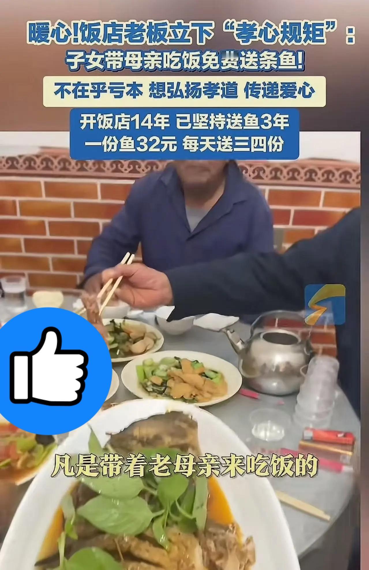 河南周口老板太会整活!带爸妈下馆子直接送32元鲜鱼,3年狂送万条,网友馋哭又暖心! 开餐馆14年的周老板,见带娃聚餐的挤破门,陪父母吃饭的却寥寥。目睹老人怕添负担劝子女少点餐的一幕,他立下硬核规矩:带爸妈来就送鲜鱼。 这鱼堪称“孝心催化剂”,诚意比别家小菜清汤足十倍。老板不为赚大钱,就想让陪伴藏进饭香。网友调侃“娃带妈来能领不”,玩笑里全是认可。孝心从不是空话,这盘鱼像小太阳,暖了食客也唤醒亲情!
