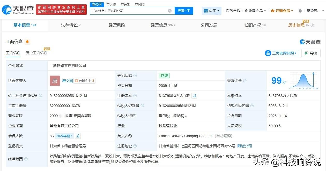 【兰新铁路甘青公司增资至约813.8亿增幅约6.5%】 天眼查App显示,近日