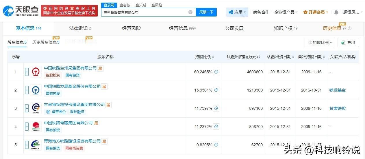 【兰新铁路甘青公司增资至约813.8亿 增幅约6.5%】 天眼查App显示,近日,兰新铁路甘青有限公司发生工商变更,注册资本由764.16亿人民币增至约813.8亿人民币,增幅约6.5%,同时部分高管发生变更。 该公司成立于2009年11月,法定代表人为唐文国,经营范围包括铁路建设和客货运输,运输设施的安装、维修和服务,房地产开发、土地综合开发等。股东信息显示,该公司由中国铁路兰州局集团有限公司、中国铁路发展基金股份有限公司、甘肃省铁路投资建设集团有限公司等共同持股。 天眼查信息: