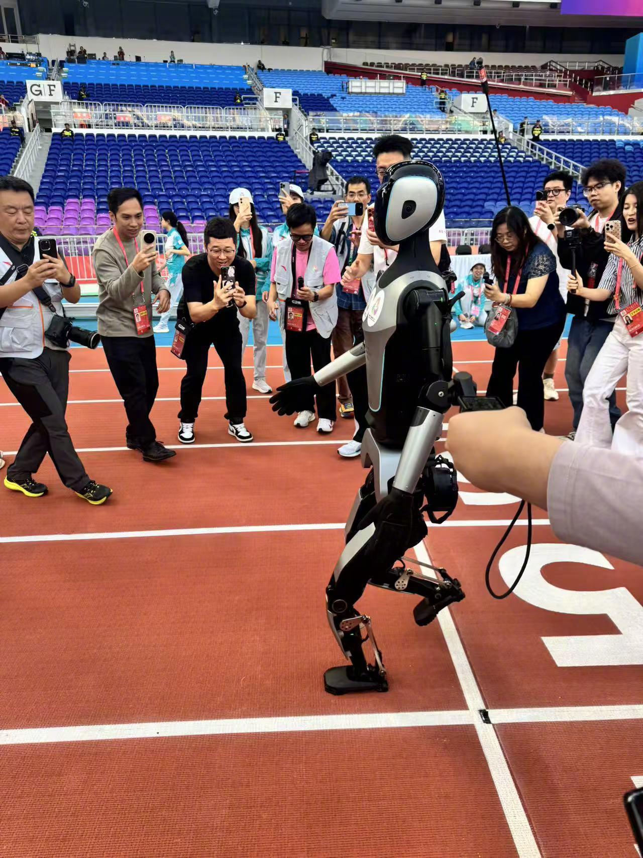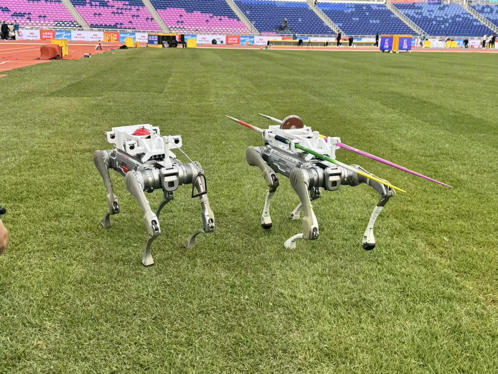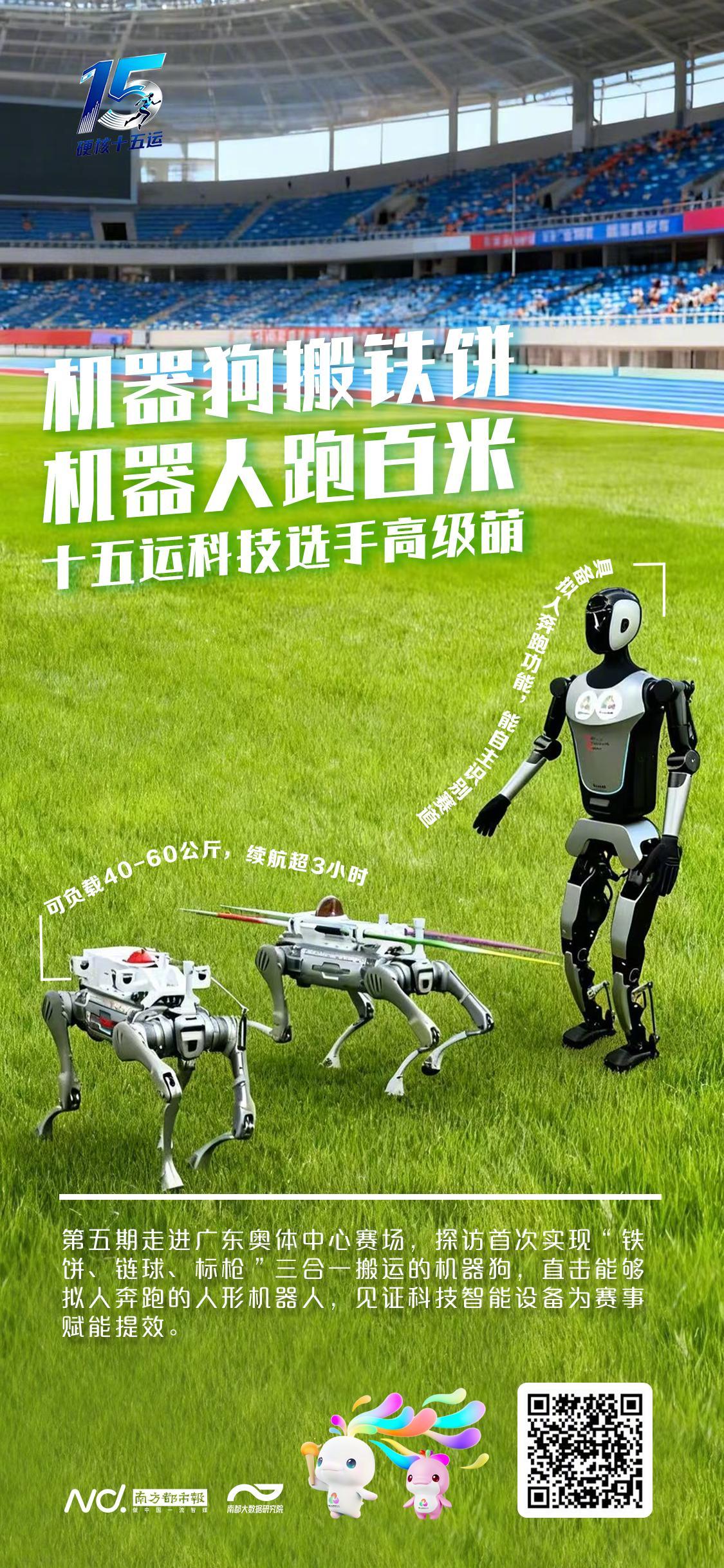 【机器狗搬铁饼,机器人跑百米,十五运科技选手高级萌】 11月17日下午,广东奥体中心的跑道上,一场别开生面的“百米大战”正在上演。起跑线上,十五运会吉祥物“喜洋洋”“乐融融”,以及一位特殊选手——身高1米63的人形机器人都蓄势待发。不远处的草坪上,两只四足机器狗正灵活地穿梭在标枪、铁饼之间,稳稳地将器材运送到指定位置,动作利落。据介绍,“这是首次在全运会上,让机器狗同时负责标枪、铁饼、链球三个长投项目的器材搬运。”据了解,这两只机器狗背上的前后双向卡扣专为标枪设计,方便裁判与志愿者取放。针对链球、铁饼男女项目尺寸规格不同的特点,本次投入使用的机器狗搭载了“一键多用”结构件,一套方案适配三个项目,实现身兼数职。“两只狗,够忙吗?”面对提问,相关负责人回应:“本次我们共投入两台机器狗,采用轮转作业模式——一只外出拾取器材,另一只在待命点待机,循环交替工作。”单只机器狗的负载能力可达40至60公斤,续航时长超3小时,移动速度最高能达到6米/秒,两台设备足以保障相关工作顺利开展。相较于以往的小型机器狗,这款“大狗”在承重能力与电池续航方面均更具优势,还专门优化了长时间奔跑状态下的能耗平衡问题。