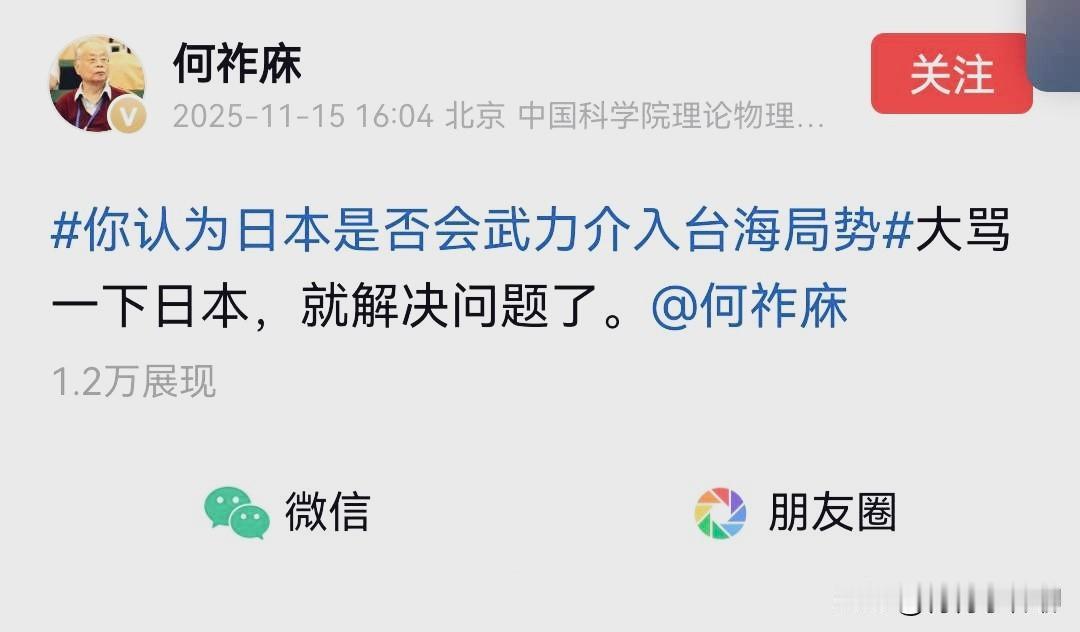 攘外必先安内,这是老祖宗留下来颠簸不破的真理!自国民党反动派借此实施独裁反动统治和投降主义的借口之后,我们似乎连着这个真理也不相信了! 但历史的教训告诉我们,面对外侮、面对强敌,我们如果连内部的意见都难以统一,都在各说各话、各弹各调,我们又如何形成强大的力量对抗敌人? 高市早苗的“存亡危机”谬论,已经等同于宣战书,是赤裸裸的军国主义侵略立场,而我同胞却还在争论该如何以“大国的胸襟和格局,从容应对”,有人非议我驻大阪总领事的“斩首”说,有失大国风度,还有人讽刺央视机构帐号“玉渊谭天”,缺少风度,竟粗话脏话一起甩,是“战狼”嘶吼! 最可恨的是,有人以近百岁的年纪冷嘲热讽我外交态度,有个自称是经济学家的什么什么辉,居然对日本外务省的低阶外交官突访大表欢迎,什么什么灰,你可知道,人家是来兴师问罪的,他倒好,说什么来得都是客,“误解”需要沟通消除,什么误解?是侵略无罪吗?还是真的威胁日本的生死存亡了? 我们面对的才是“存亡危机”,我们要让全国老百姓,包括上海的同胞们,正视这个严峻的现实:日本军国主义已然复活,他们以“存亡危机”为借口,发动了所有的侵略战争,我们要让包括上海同胞在内的所有中国人都有危机意识,而不是“等等就过去了”!