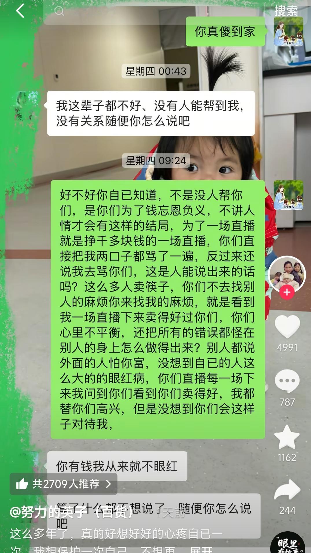 现在全网最糟心的女人就是小英子了吧! 不是因为拍视频没人看也不是因为带货没人买,而是因为亲嫂子居然为了一双筷子,造谣她离婚了 说真的,我最近刷到农村四哥家的瓜,直接让我和朋友都惊呆了!亲姑嫂居然因为一双筷子反目成仇,连姐弟情都彻底闹崩,我晕,这事儿也太魔幻了吧?不是吧?真的假的?就一双普普通通的筷子,既不能当饭吃,又不能当钱花,居然能让十几年的亲属关系说断就断,这利益的魔力也太大了吧?别人说“万事皆有因缘”,可这因缘怎么就栽在一双筷子上了? 老实讲,四哥的大姐最早带孩子去筷子厂直播,那个厂子我好像刷到过,就是普普通通的日用品生产厂。大姐的直播就在厂区里拍,对着机器和成品筷子唠嗑,介绍材质和用法,这场直播没出任何岔子,后来还一直靠这款筷子带货挣钱,这可是她的重要收入来源,就像上班族每个月的工资一样,直接影响日常开销。关键是,她没和厂家签独家协议,也没跟其他网红说“这筷子只能我卖”,市场上本来就有好几个网红一起带,大家各凭本事卖货。 然后啊,英子也跑去同款筷子厂直播了!据英子自己说,单场直播下来能挣一千多块钱,说实话,这钱在网红带货里真不算多,但架不住日积月累啊。本来这事儿吧,提前跟大姐打个招呼,说一句“我也想带这款筷子”,说不定就能商量着来,结果英子没提前沟通,直接就入局了。我之前有个朋友,和表姐一起做微商,没提前说就卖同款护肤品,结果表姐觉得被抢了客源,直接拉黑删好友,现在好几年没来往,你说这事儿怪谁呢?郁闷的是,亲戚间连这点默契都没有吗? 勇哥知道英子也带同款筷子后,直接炸了!在和别人私下聊天的时候,把四哥和英子骂得很难听,具体骂了啥没细说,但听转述的人说,那话真的很难听。然后神奇的事情来了,有个“他人”听到勇哥的话,居然直接给四哥打了电话,把这些话原封不动地转告了四哥。我晕,这个“他人”到底是谁啊?是真的路人看不惯勇哥的做法,还是四哥早就知道大姐两口子不满,故意找了个人当“传声筒”?这事儿想想就觉得有意思,太悬疑了! 四哥听完转述后,居然说“大姐是亲姐姐,不便出面”,然后就一直沉默,从头到尾没说过一句公道话。崩溃的是,四哥的父母倒是明事理,直接站队英子,没向着自己的女儿。你说这事儿多奇怪?父母都表态了,作为弟弟的四哥反而隐身了,这操作谁能看懂?别人说“沉默是金”,但这时候的沉默难道不是火上浇油吗?因缘这东西,有时候真的经不起这么耗,越沉默误会越深,最后想挽回都难。说实话,四哥这“不便出面”的理由,真的站得住脚吗? 英子知道勇哥辱骂自己和四哥后,直接爆发了!她本来就是火炮脾气,最受不了别人背后嚼舌根,更何况勇哥的话还戳中了她的痛处。老实讲,英子直接在网上曝光了大姐之前对外散播的谣言——说四哥本来不想要她,是四哥的妈妈硬逼着不准离婚。我晕,这种婚姻里的私事,怎么能随便对外乱说呢?英子都为王家生了三个孩子了,这谣言传出去,让她脸往哪儿搁?换谁谁不生气啊? 然后英子就和大姐微信沟通,结果越聊越崩,两人谁都不让谁,最后直接不欢而散,微信都不联系了。粉丝们都觉得,大姐不是坏人,就是被勇哥洗脑了,偏袒丈夫忘了娘家才是后盾。毕竟当初大姐被公公赶出家门,还是英子借钱给她买的房子,这份人情怎么说也该记着吧?本来以为四哥会出来调解,结果他还是不出面,哎呀妈呀,这亲情真的就这么凉透了?不是吧?真的假的?十几年的情分,居然抵不过一场一千多块钱的直播? 总之,通过这事儿,我想说的是,亲戚之间涉及利益,真的得提前说清楚!必须的先约定好规则,要么划分好带货品类,要么一起商量利益分配,别搞暗戳戳的操作,不然最后肯定会像四哥家这样,闹得不可开交。唔该我提醒你们,不管是带货还是合伙做生意,亲戚之间一定要坦诚沟通,别觉得“都是一家人不用计较”,有时候越是一家人,越要把话说透,不然误会只会越来越深,最后连亲戚都做不成,多不值啊!你说是吧?农村小英子 农村小英子与王大姐翻脸该咋解决 农村四哥