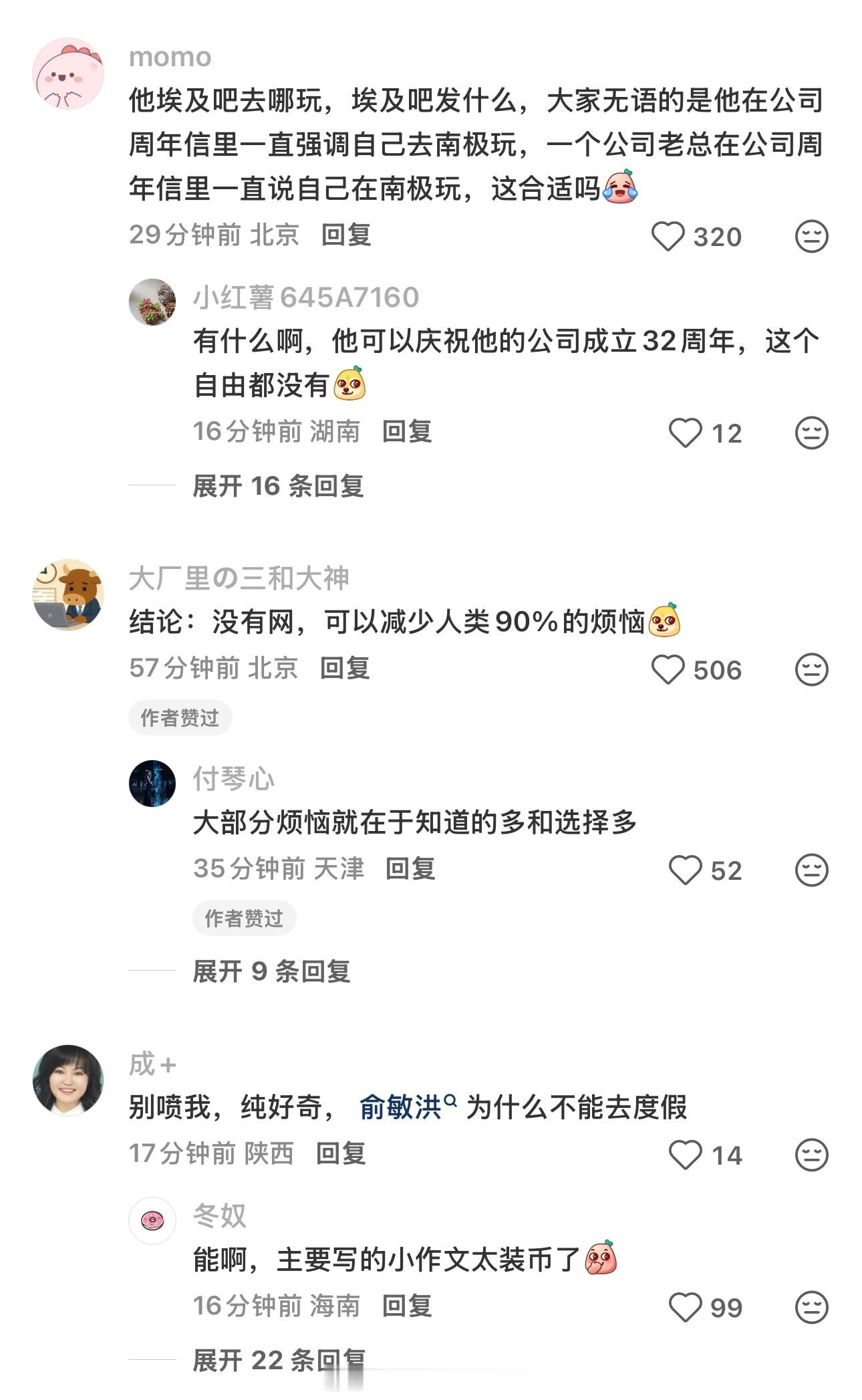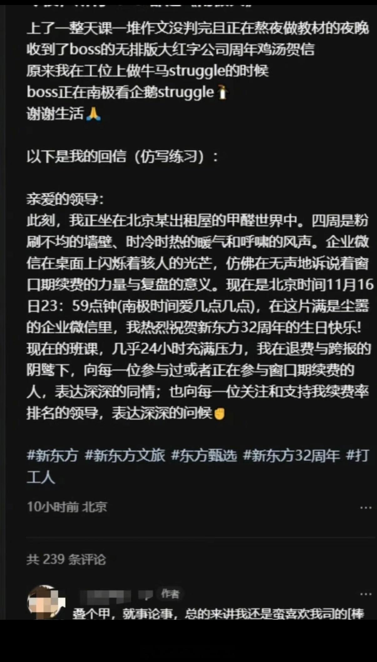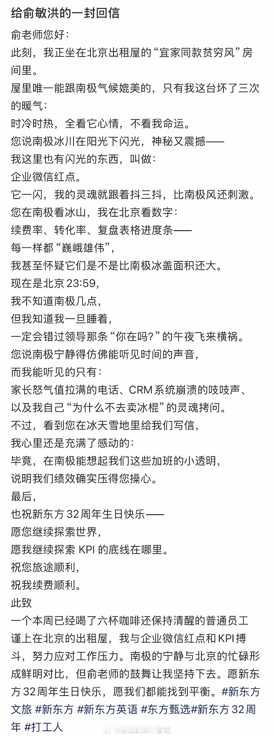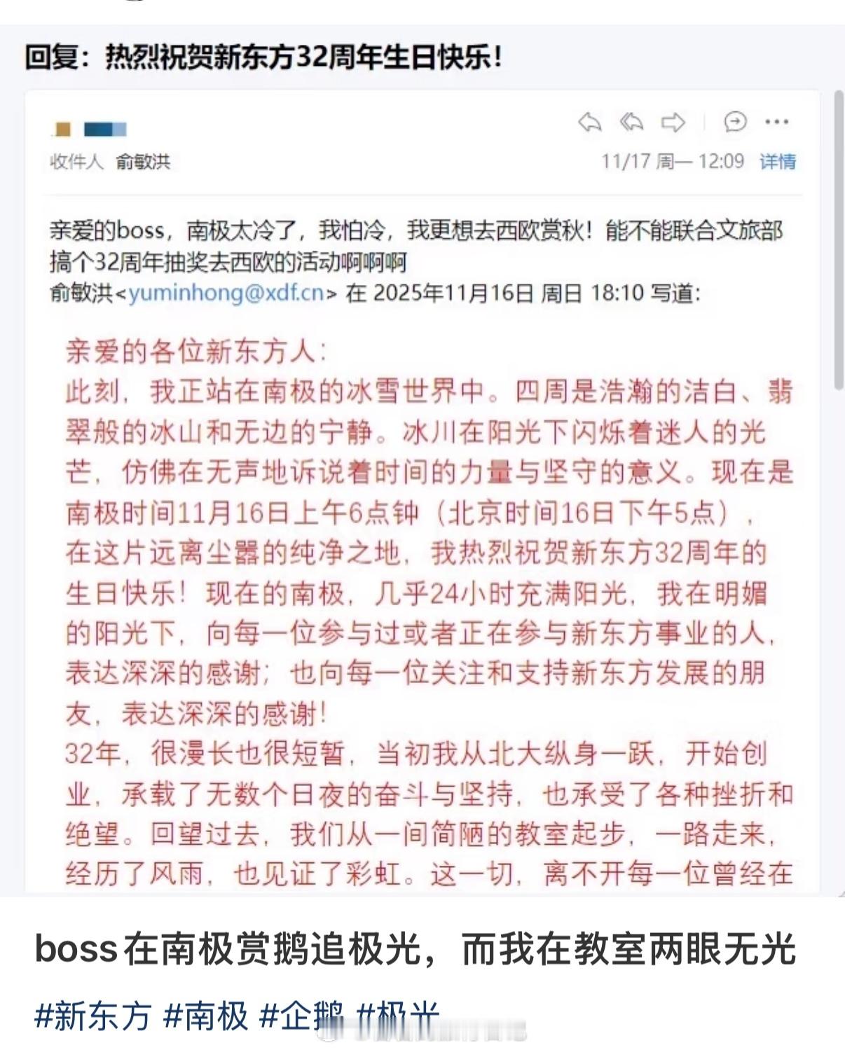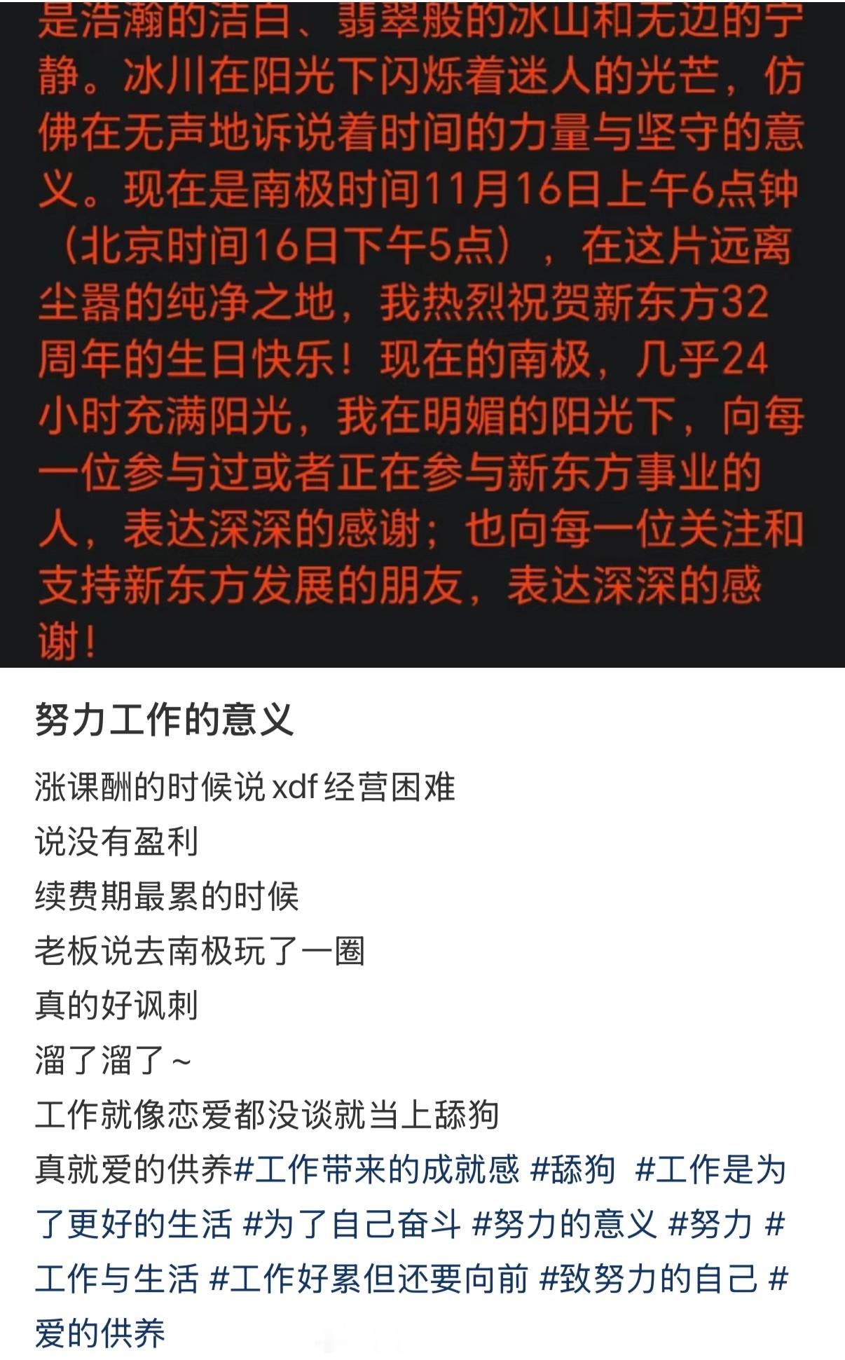 俞敏洪最近在南极旅游,哐哐哐发了一大堆视频,还给新东方员工写信,激励员工们好好努力。但员工们开始逆反了
