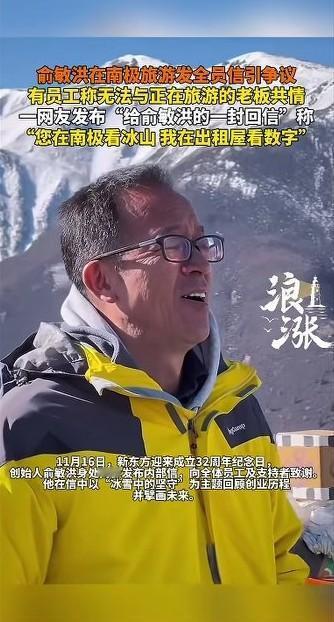 俞敏洪在南极旅游发全员信!庆祝新东方成立32周年,看着在南极逍遥自在的俞敏洪,心中充满了无限的向往。 世界那么大,我想去看看,全世界的所有人都想有机会走出去看一看,尤其是南极,北极这样的地方。 但是对于普通人来说,高昂的旅游费用让南极和北极的旅游成了可望而不可及的事情。 更重要的是,别说是去南极这样的地方了,多少人一辈子都没有出过国,一辈子没有离开过自己的家乡,一辈子就在打工的城市兜兜转转。 有多少人一辈子都没有旅过游呢?我们这个社会绝大多数人都活得十分辛苦,但是自从有了互联网之后,我们才知道,原来还有这么一群人,他们每天给我们熬鸡汤,让我们努力的工作,安心的工作,踏实的工作,等老了以后挣了足够的钱就可以出去旅游了。 可事实上,当我们辛辛苦苦努力打拼到最后以后才发现,我们除了剩了一副残破的身躯以外,其他的一无所有,我们所挣的钱还不够送到医院里的。 所以俞敏洪在南极旅游发这封全员信并没有得到公司员工的认同,这种行为看起来更像是凡尔赛,引起了很多人的反感。 看着俞敏洪整个人沉迷在南极的美景当中,仿佛都快要成仙了,大家赶紧努力加油吧,今年努力工作,明年争取让老板换个嫂子。